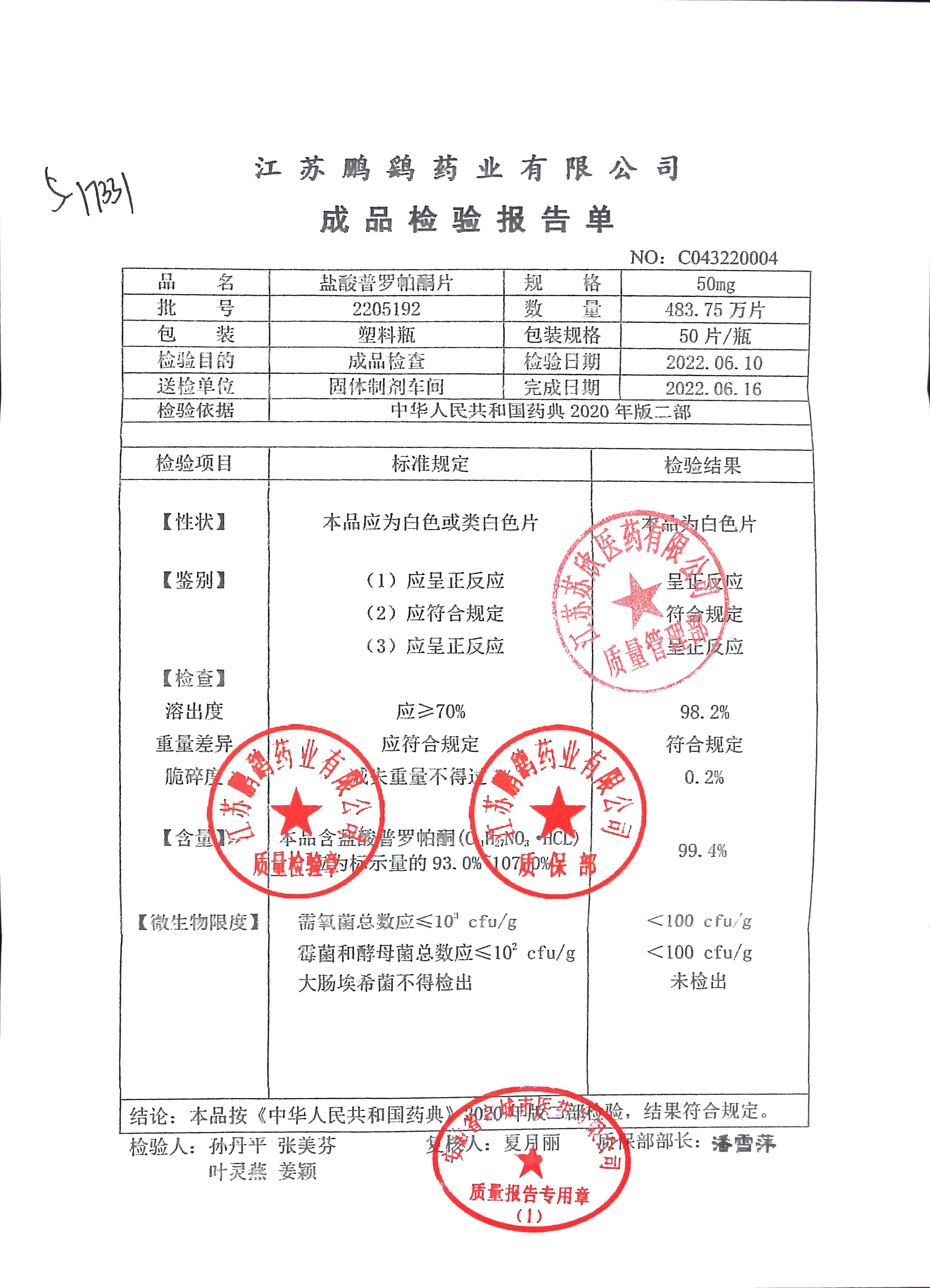 盐酸普罗帕酮片(心律平)2205192