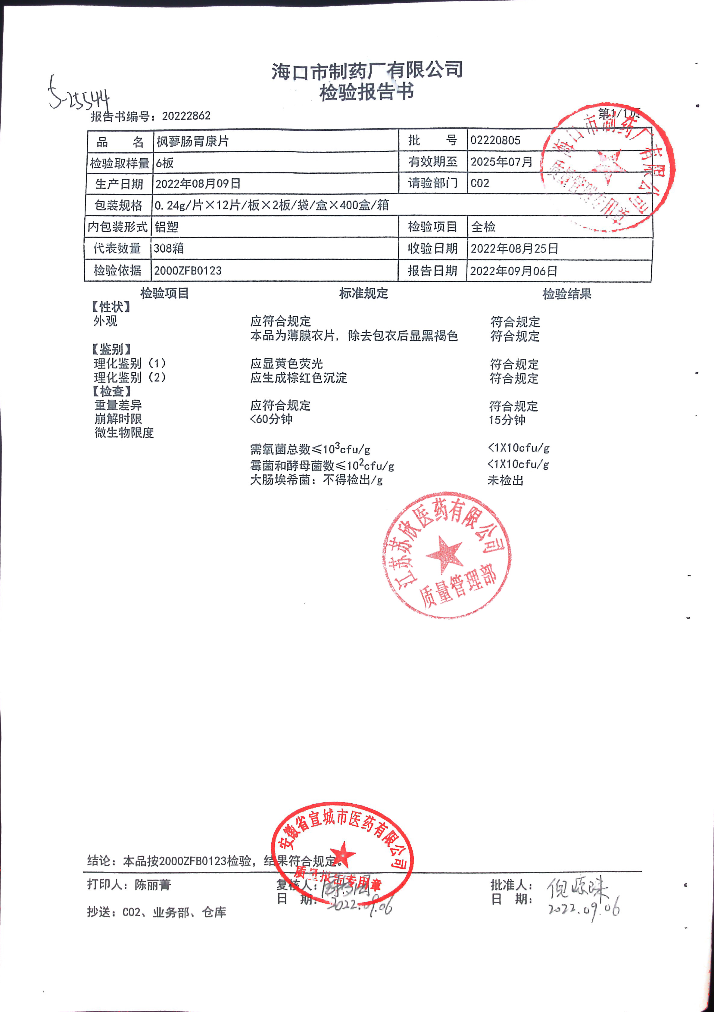 枫蓼肠胃康片02220805