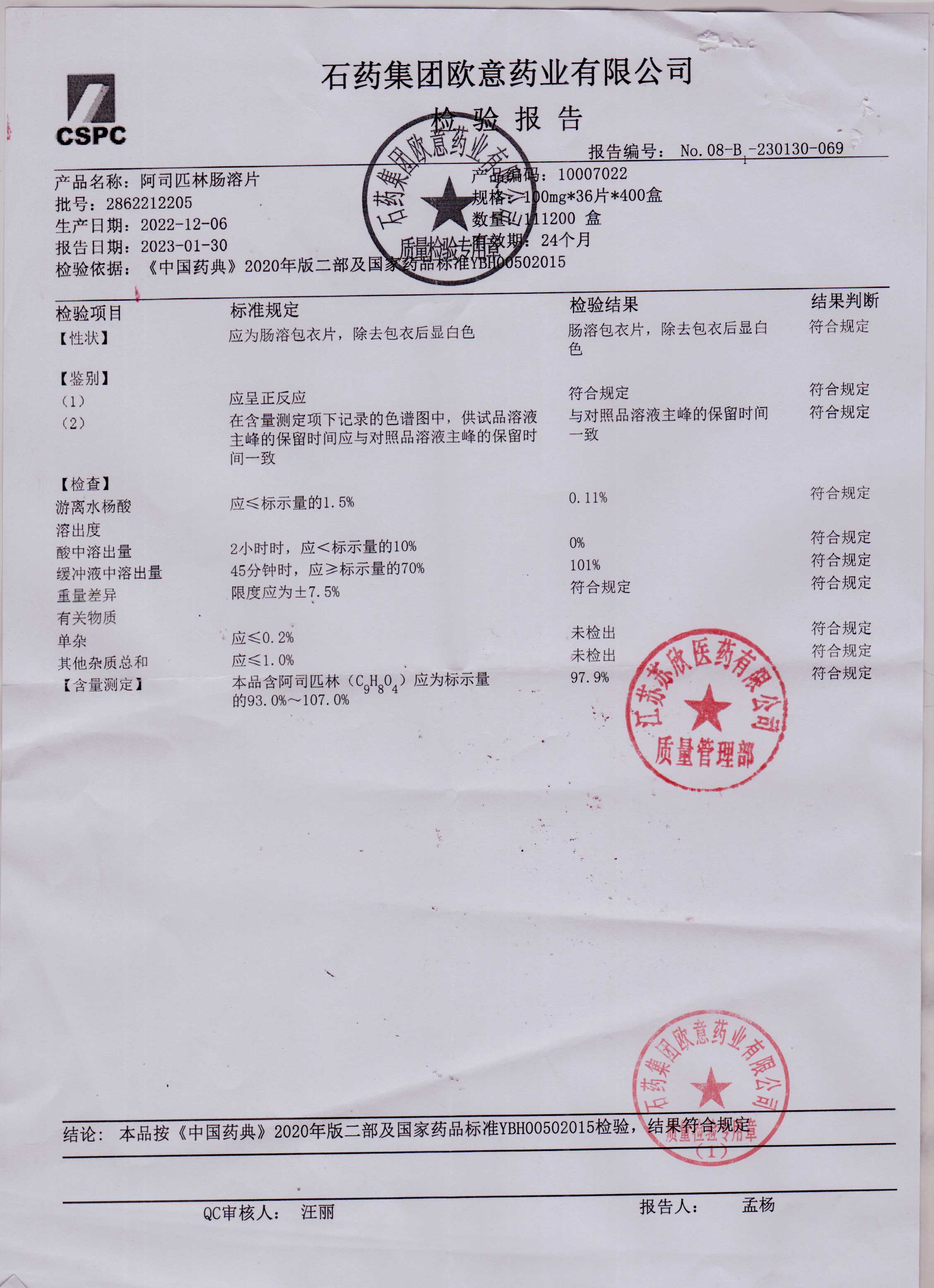 阿司匹林肠溶片2862212205