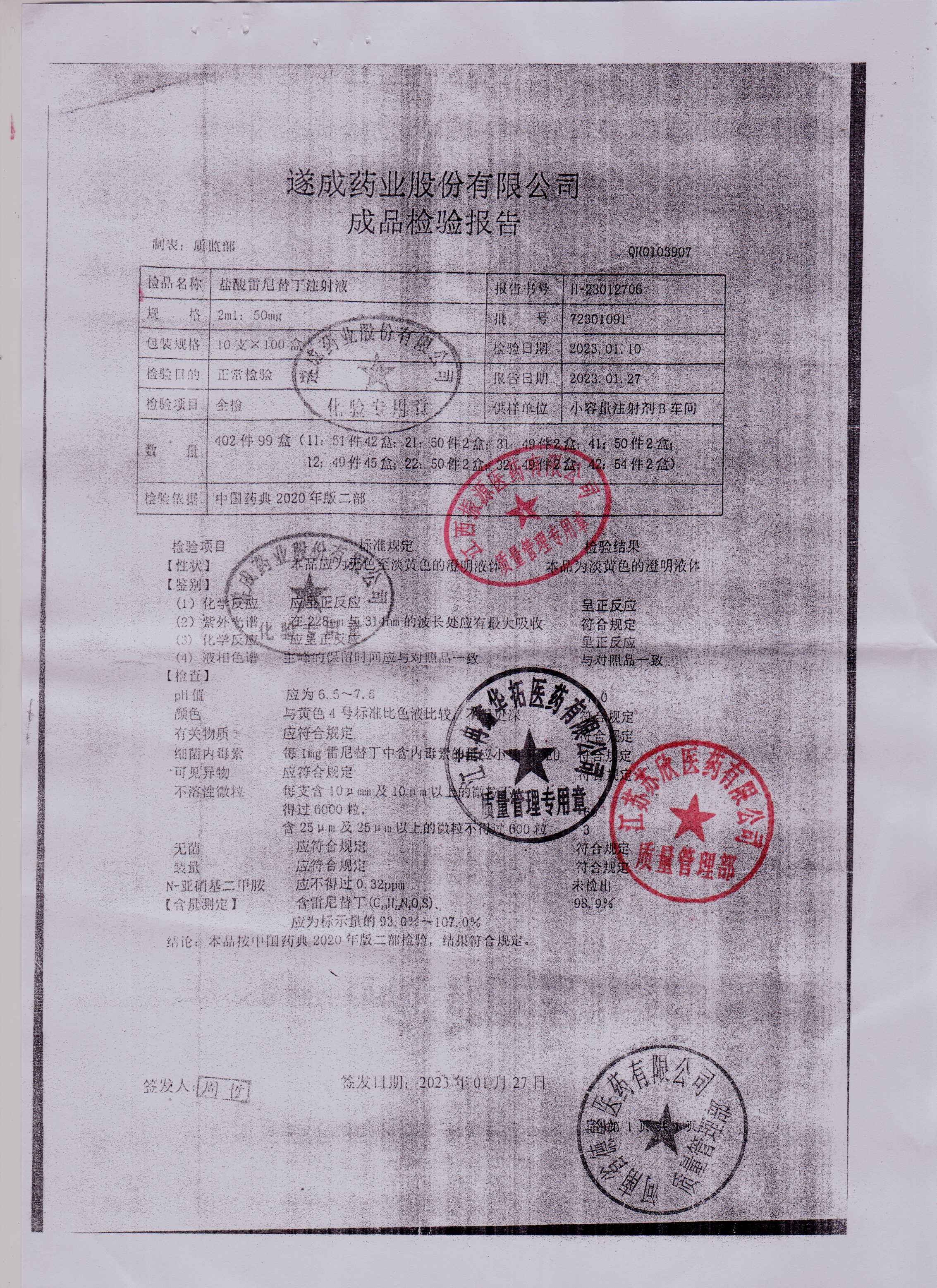 盐酸雷尼替丁注射液72301091