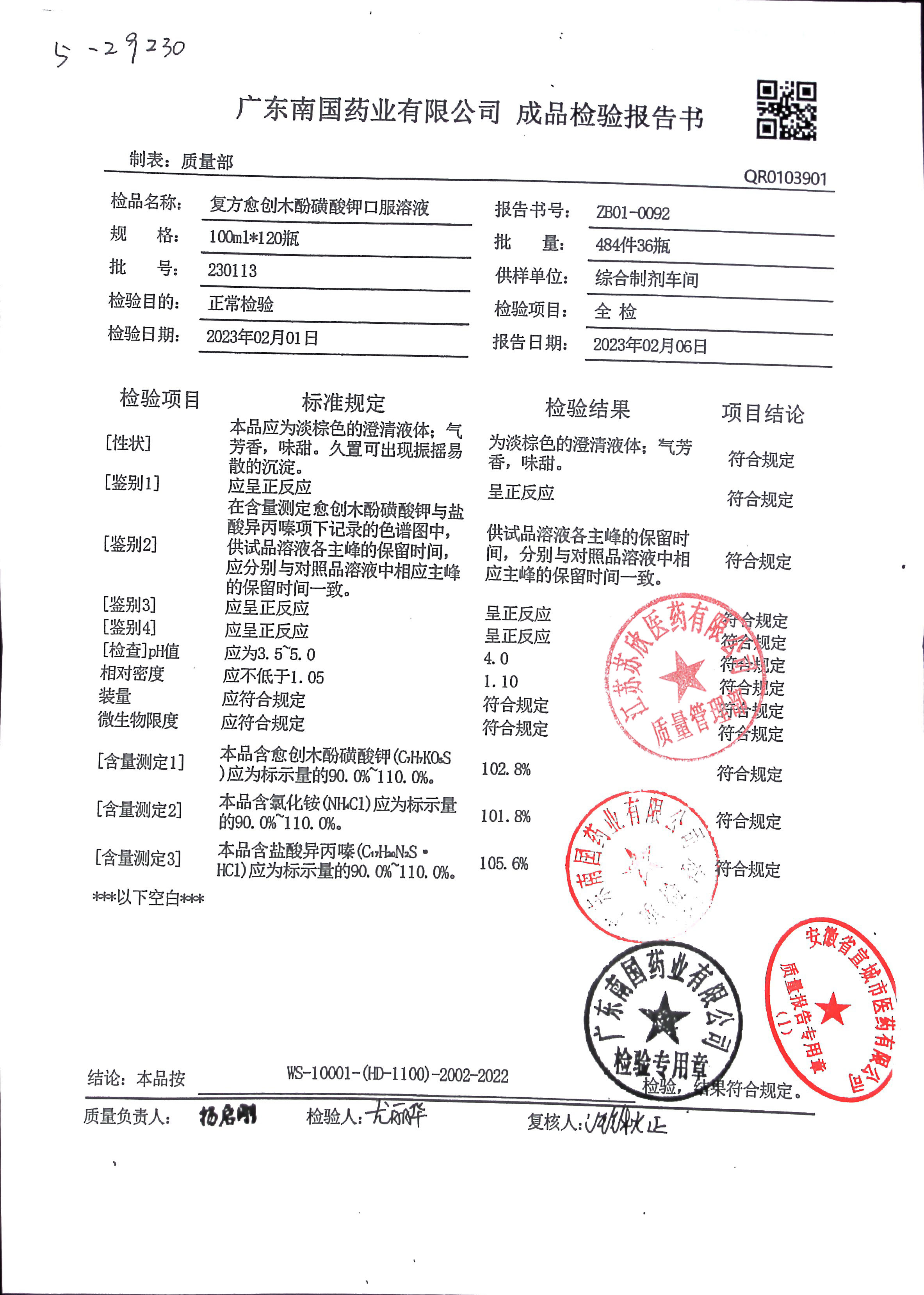 复方愈创木酚磺酸钾口服溶液(非那根)230113