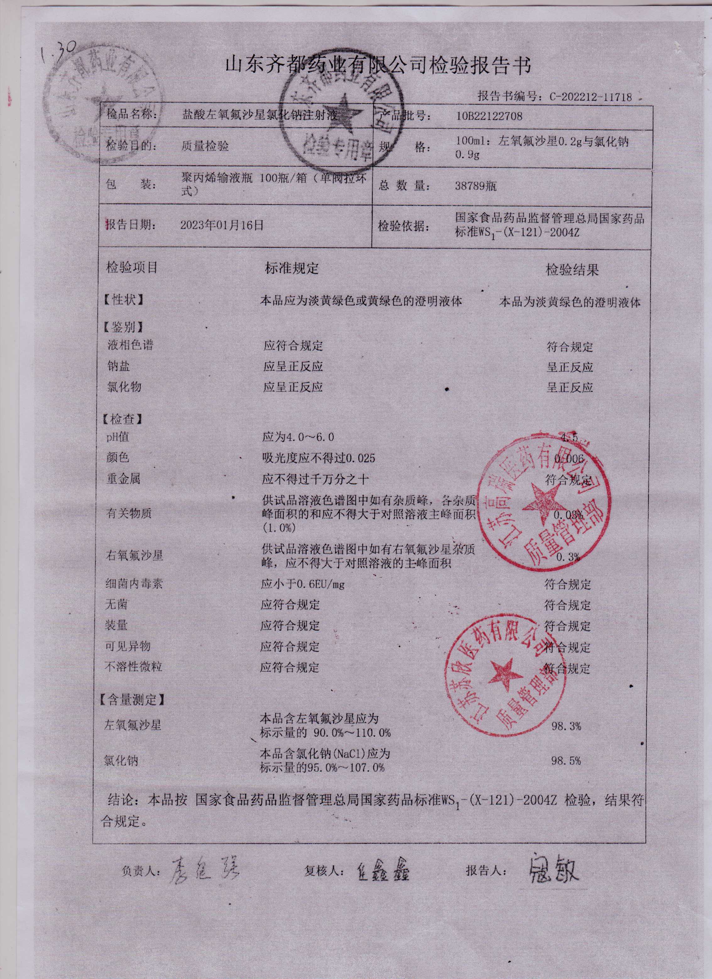盐酸左氧氟沙星氯化钠注射液10B22122708