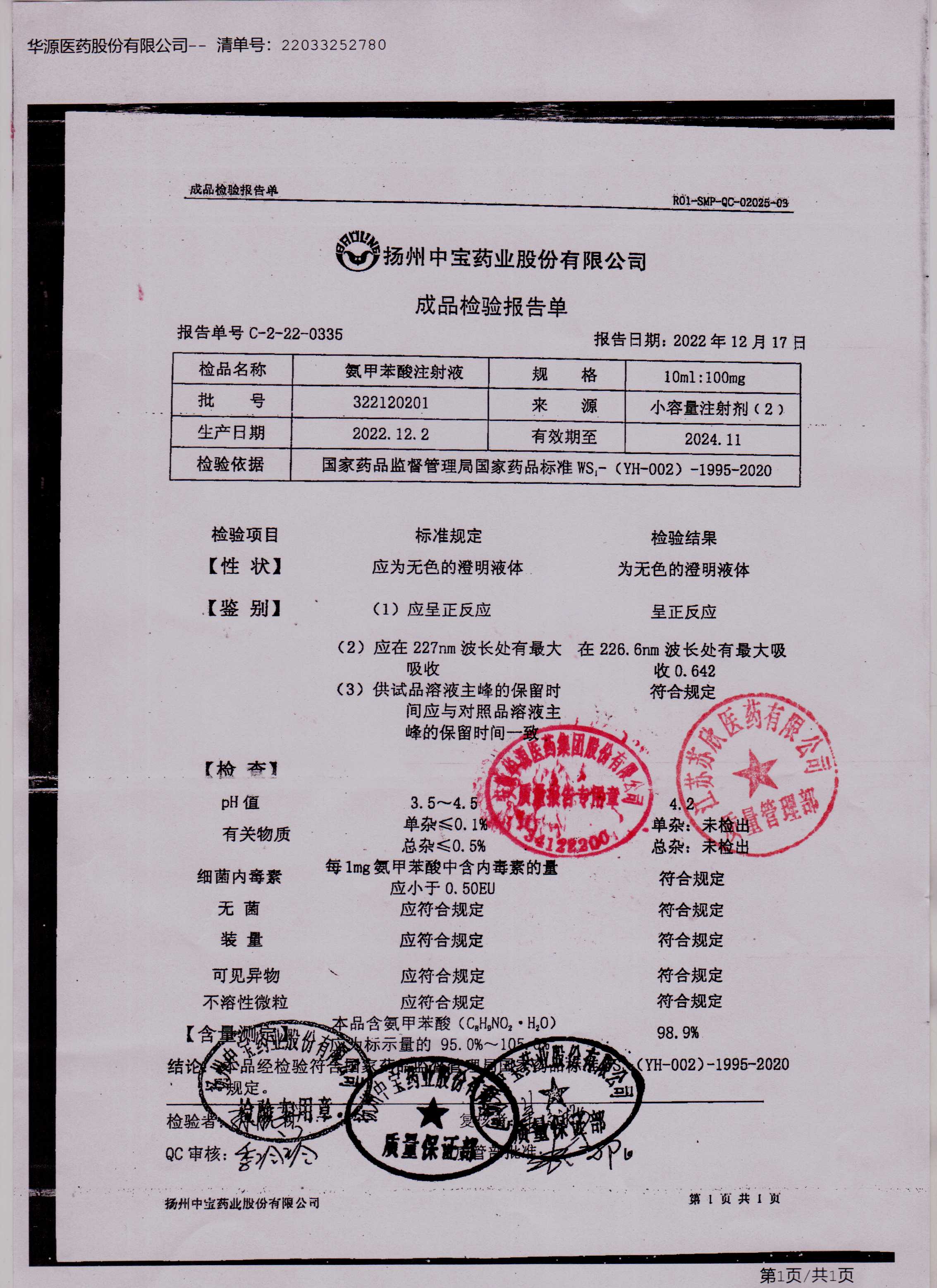 氨甲苯酸注射液322120201