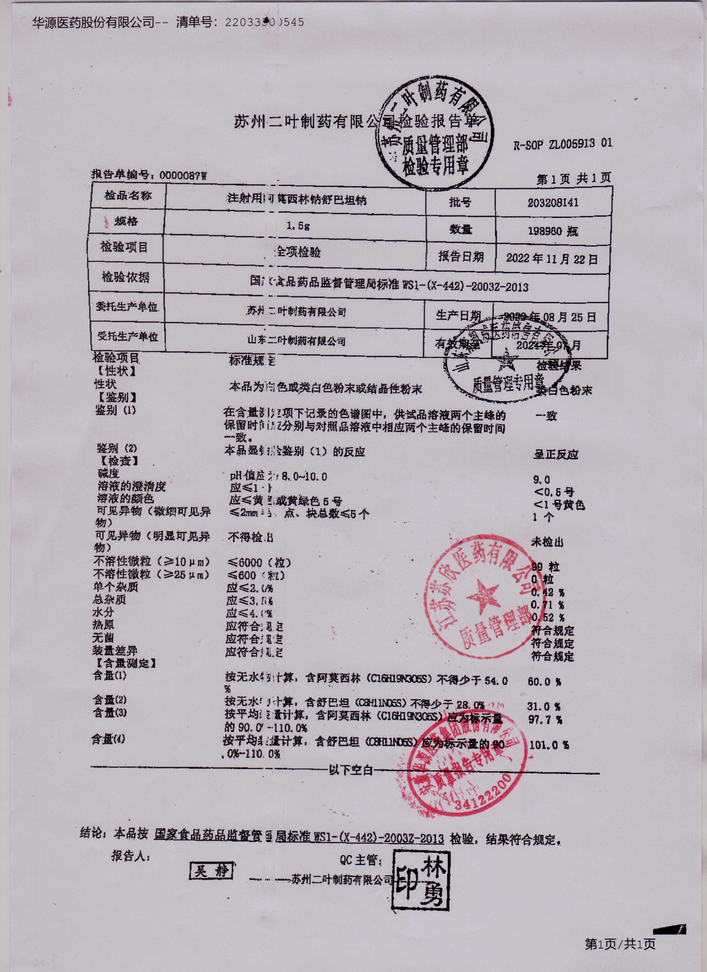 注射用阿莫西林钠舒巴坦钠203208141