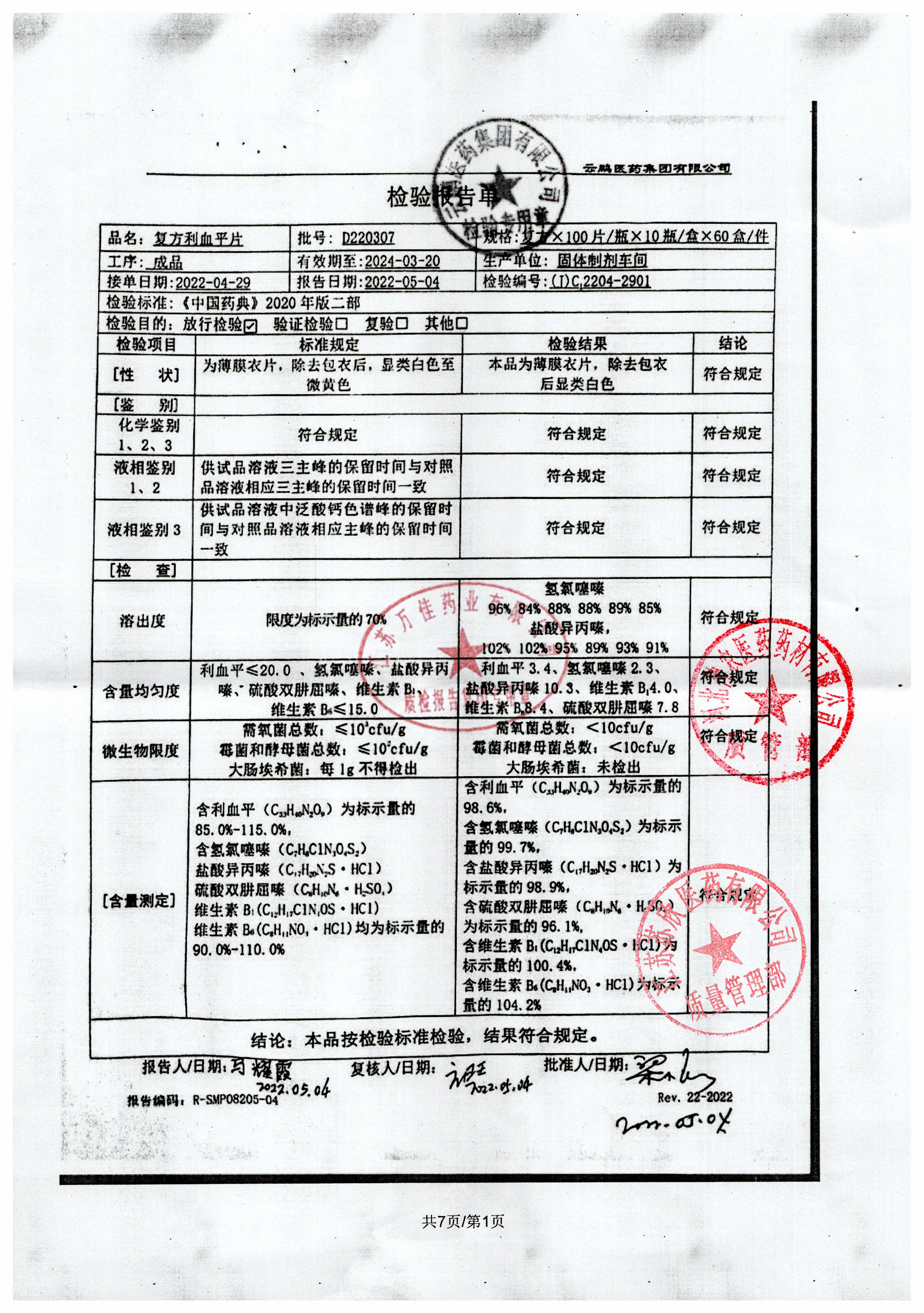 复方利血平片(复方降压片)D220307