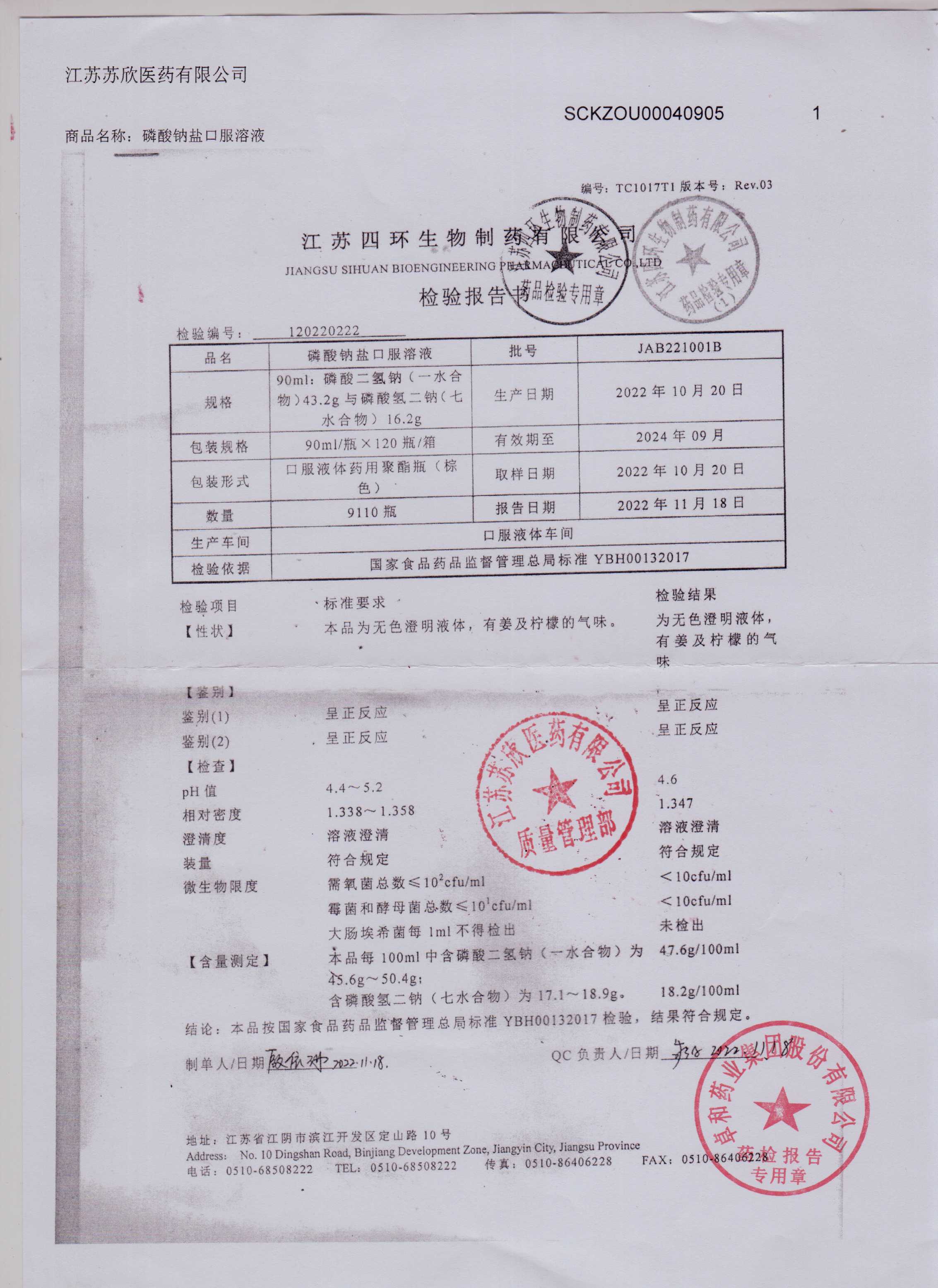 磷酸钠盐口服溶液JAB221001B