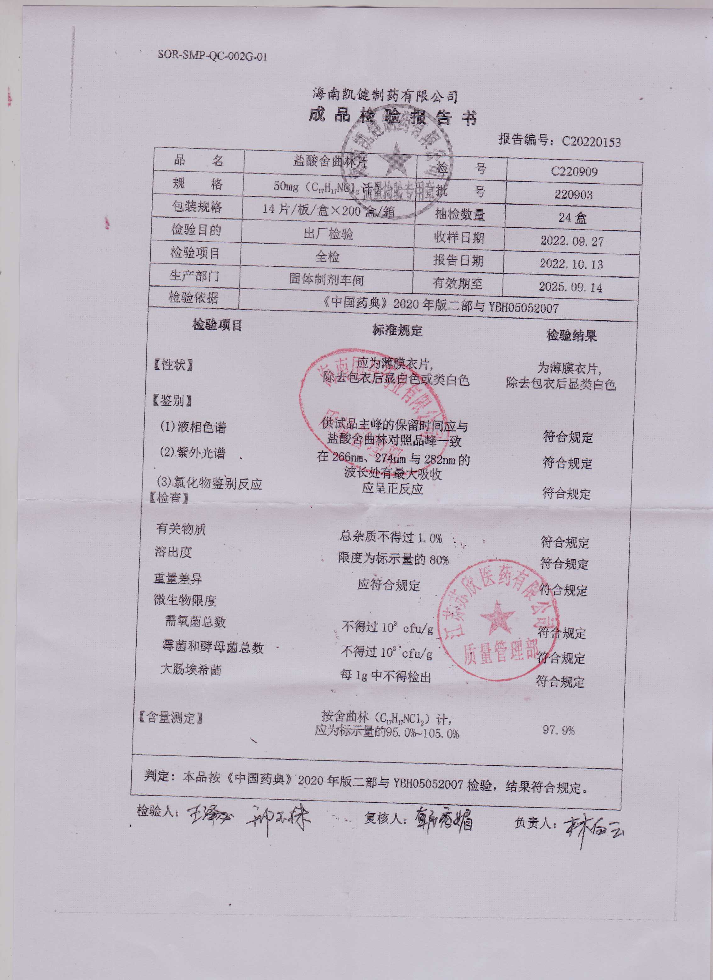 盐酸舍曲林片220903