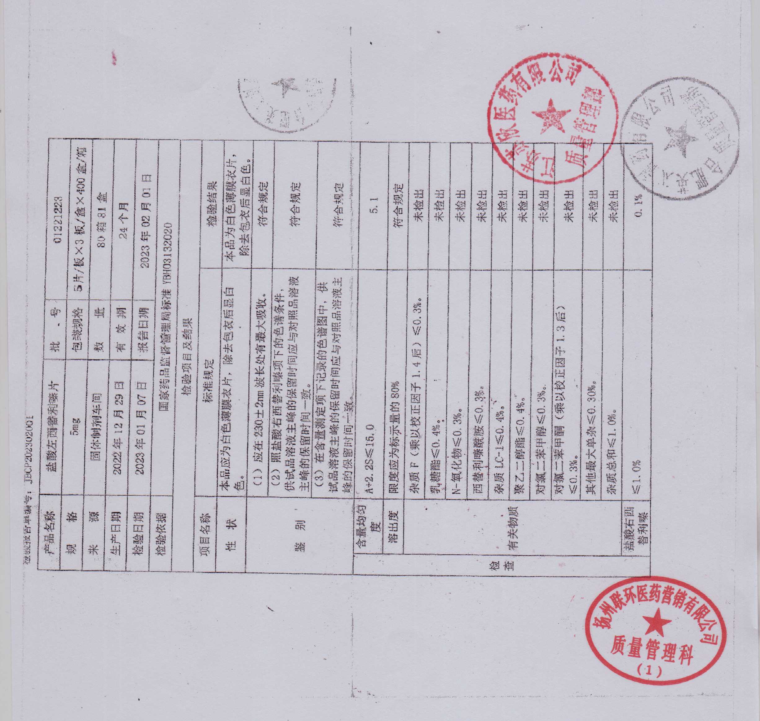 盐酸左西替利嗪片01221223