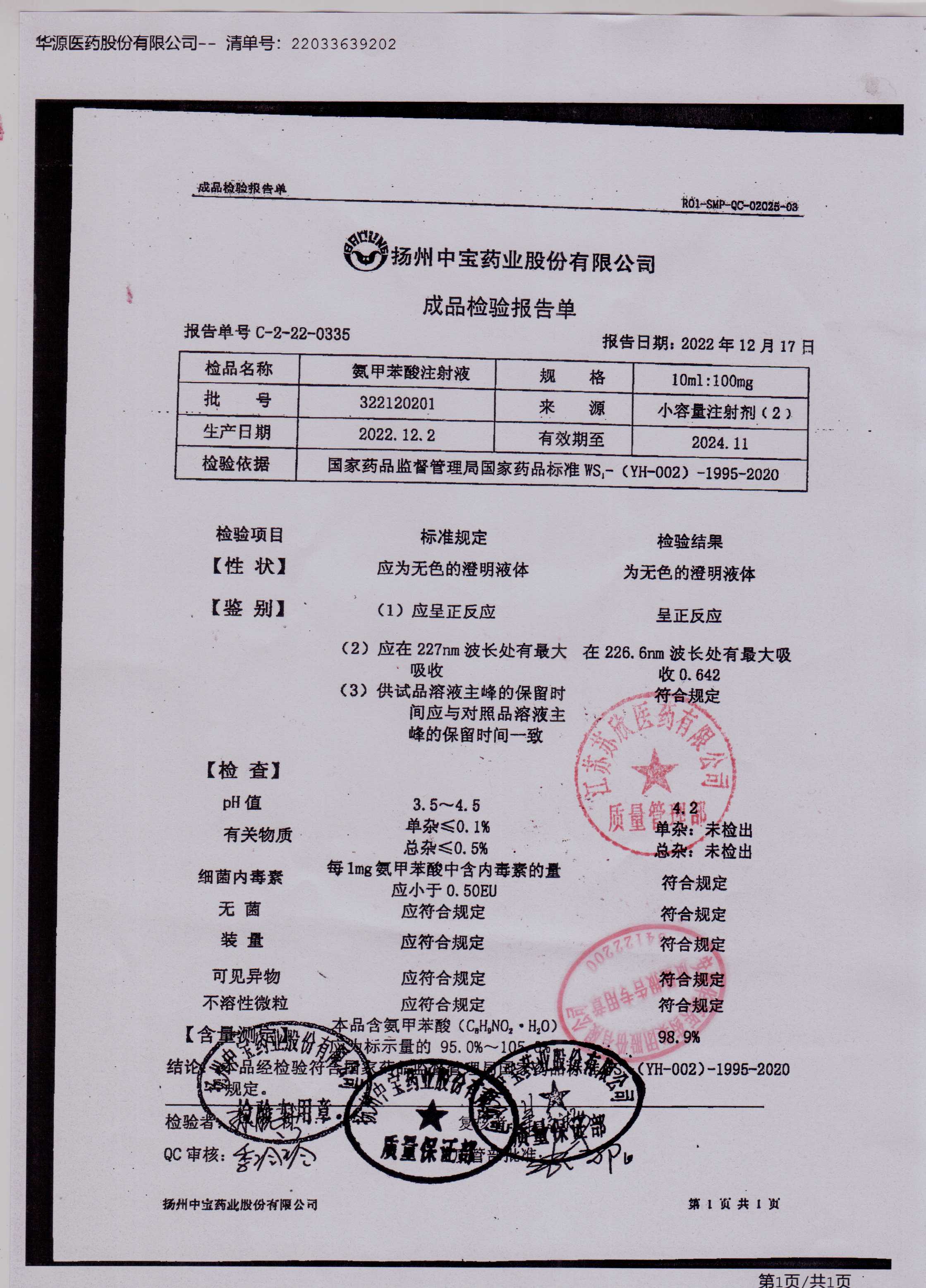 氨甲苯酸注射液322120201