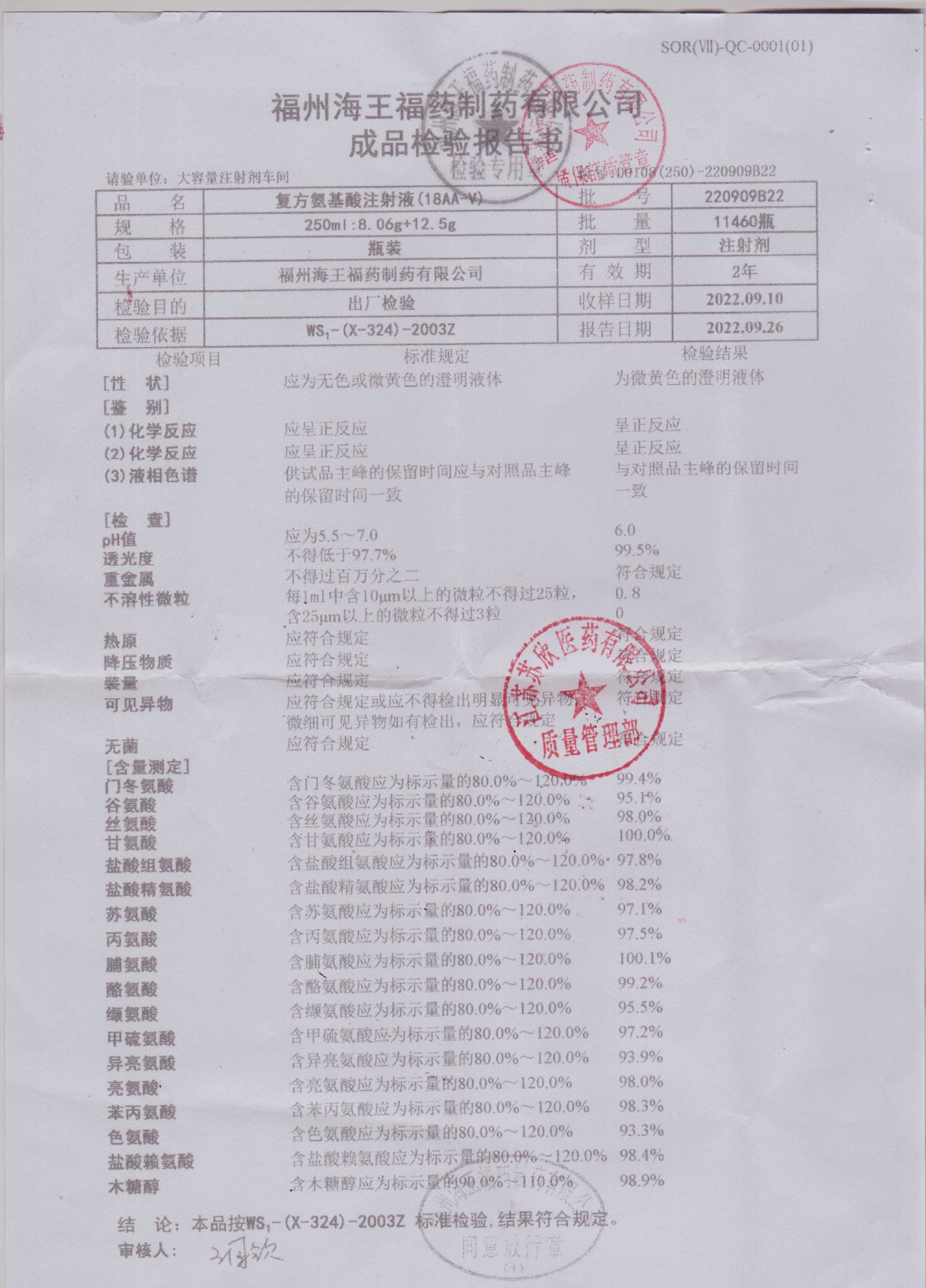 复方氨基酸注射液220909B22