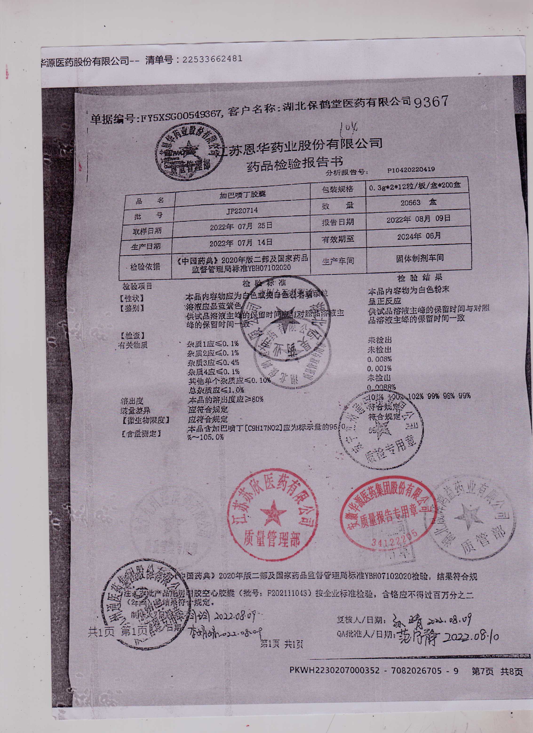 加巴喷丁胶囊JP220714