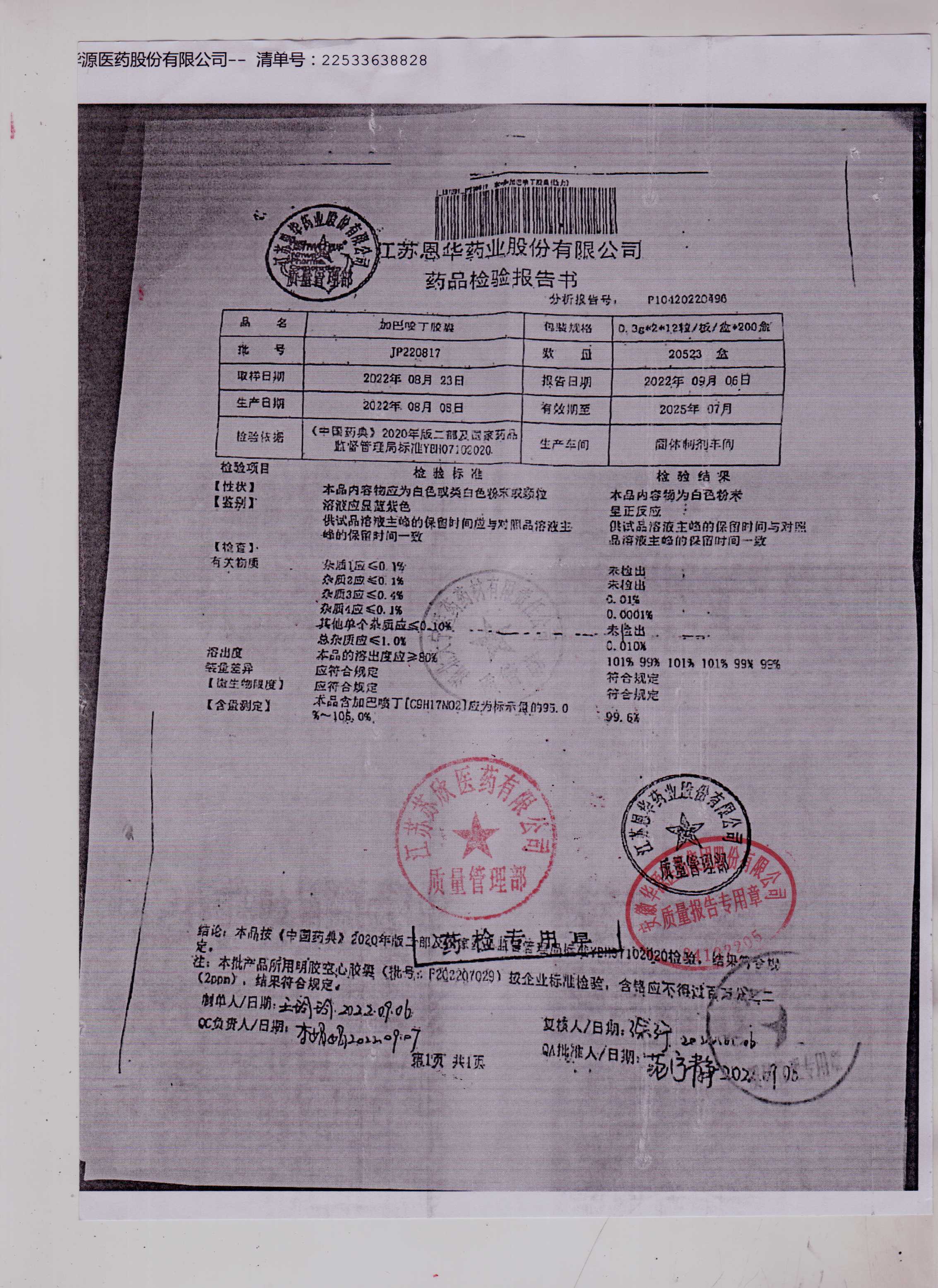 加巴喷丁胶囊JP220817