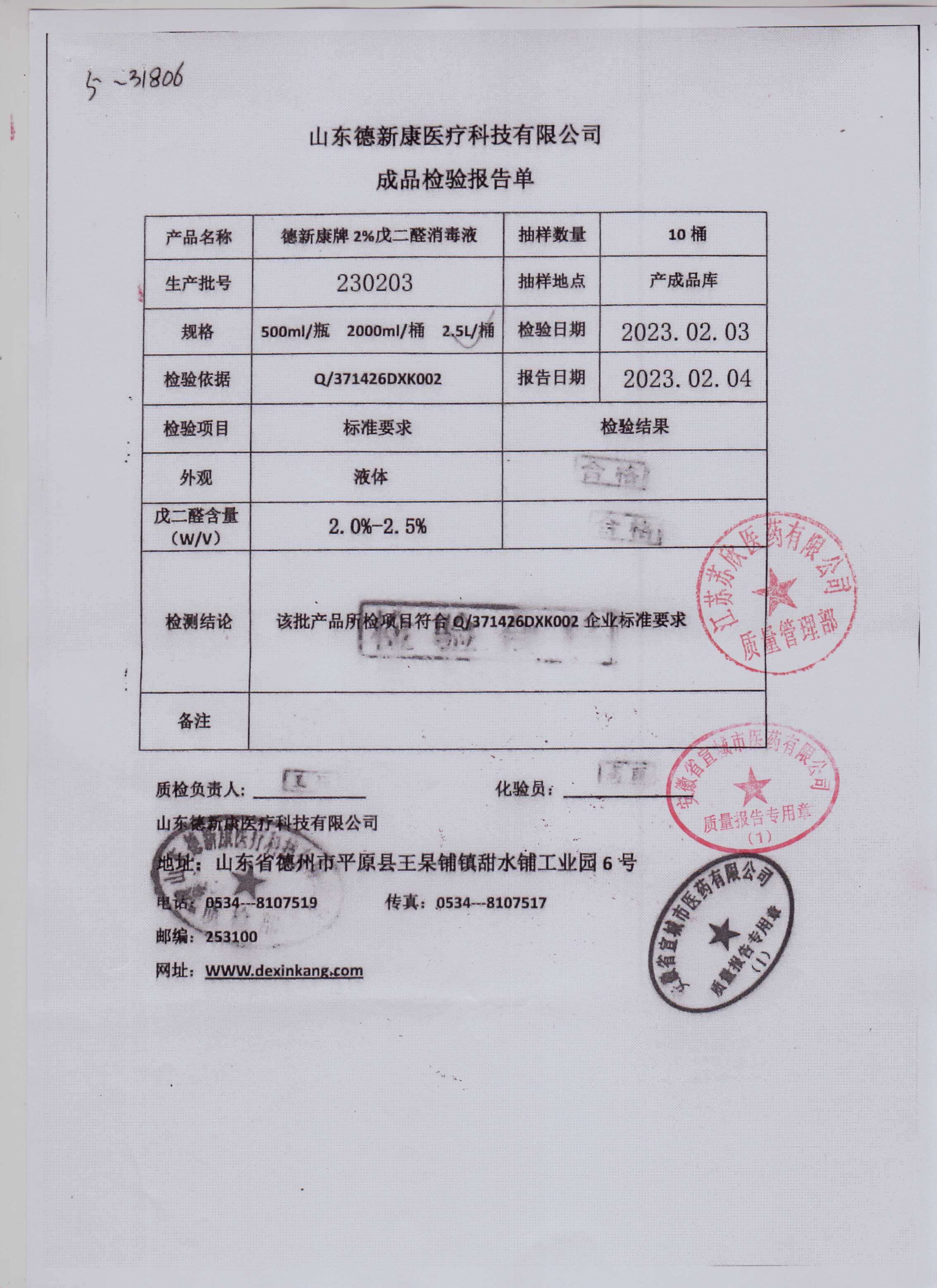 德新康牌2%戊二醛消毒液230203