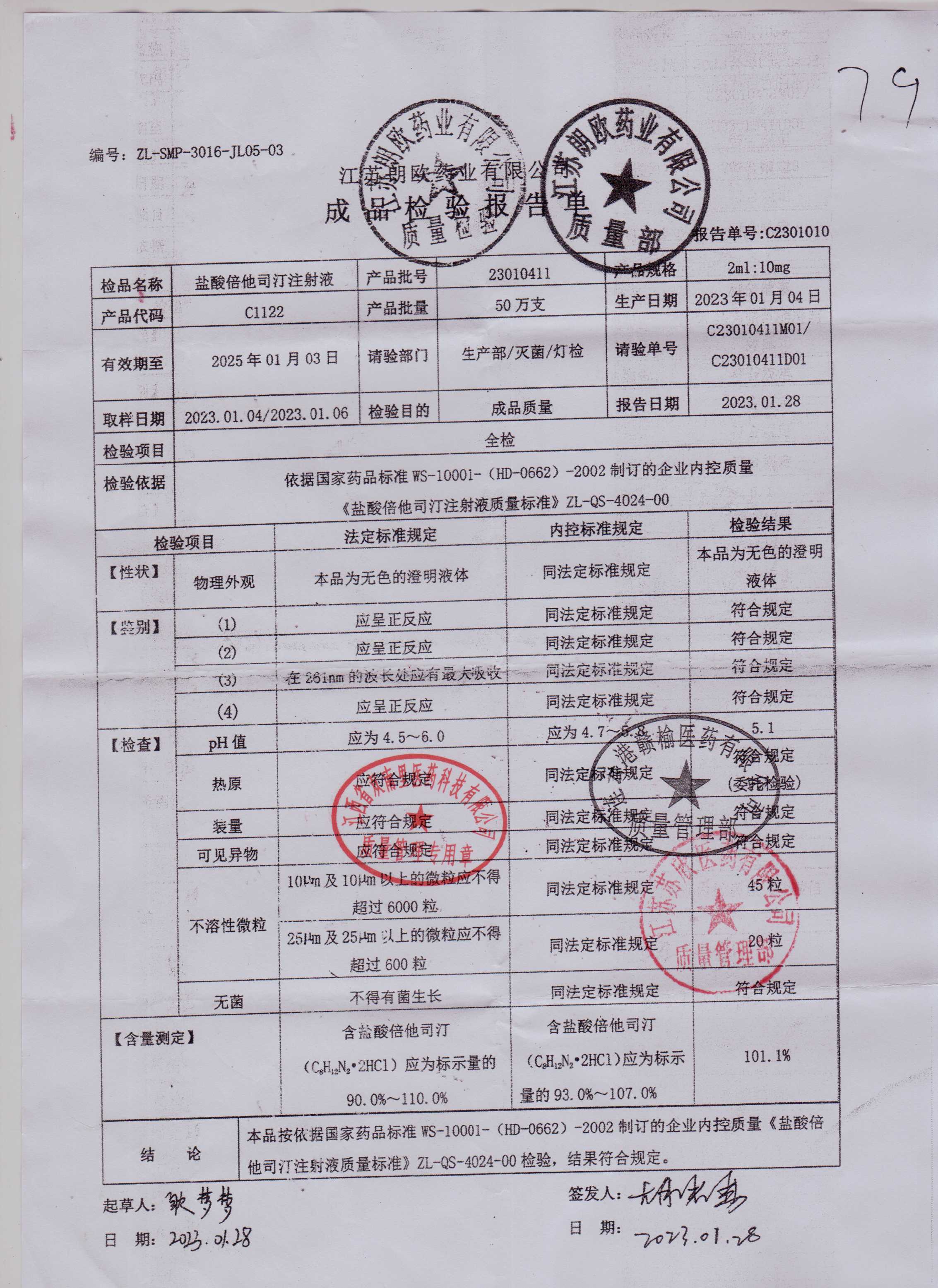 盐酸倍他司汀注射液23010411