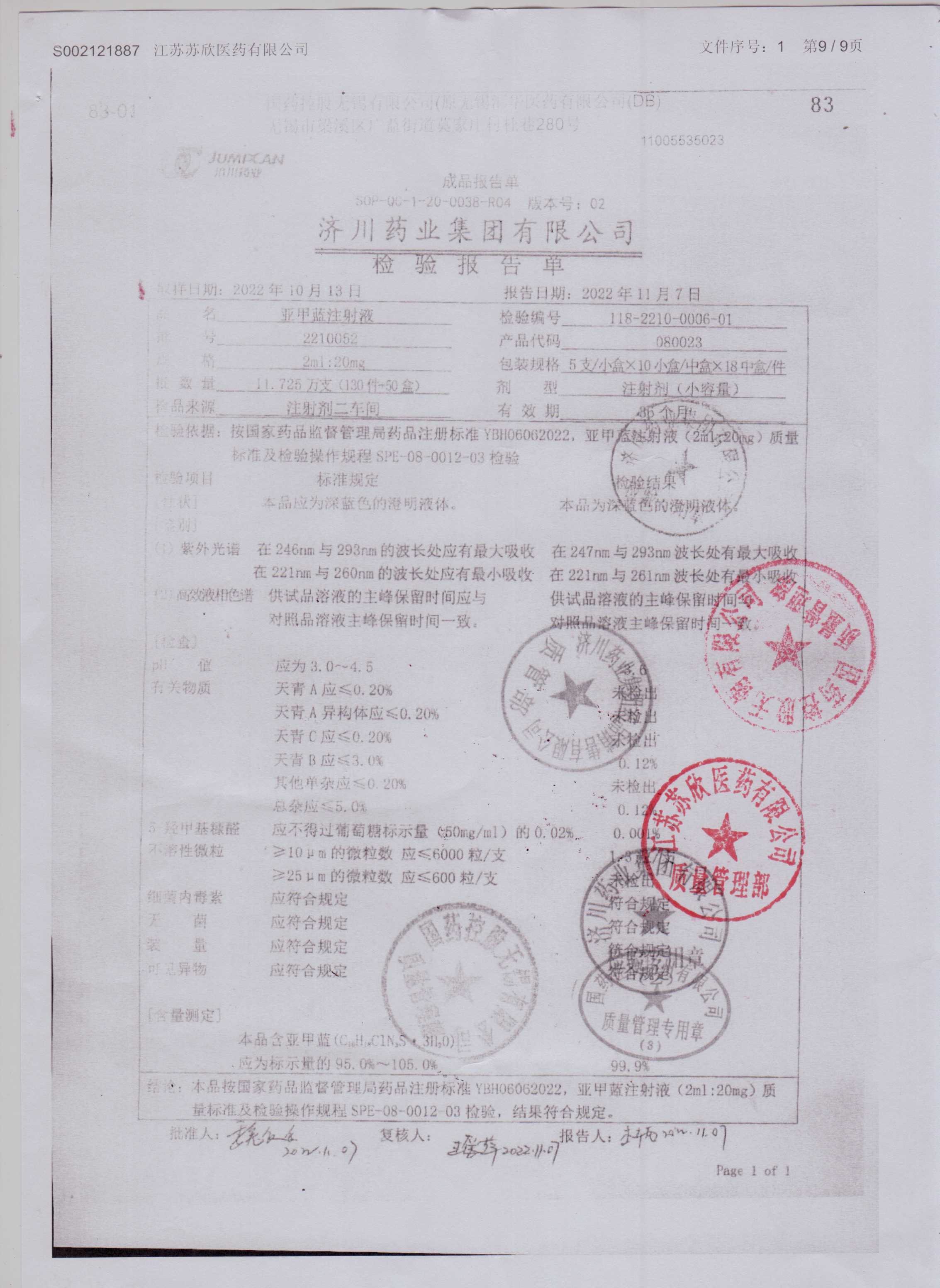 亚甲蓝注射液2210052