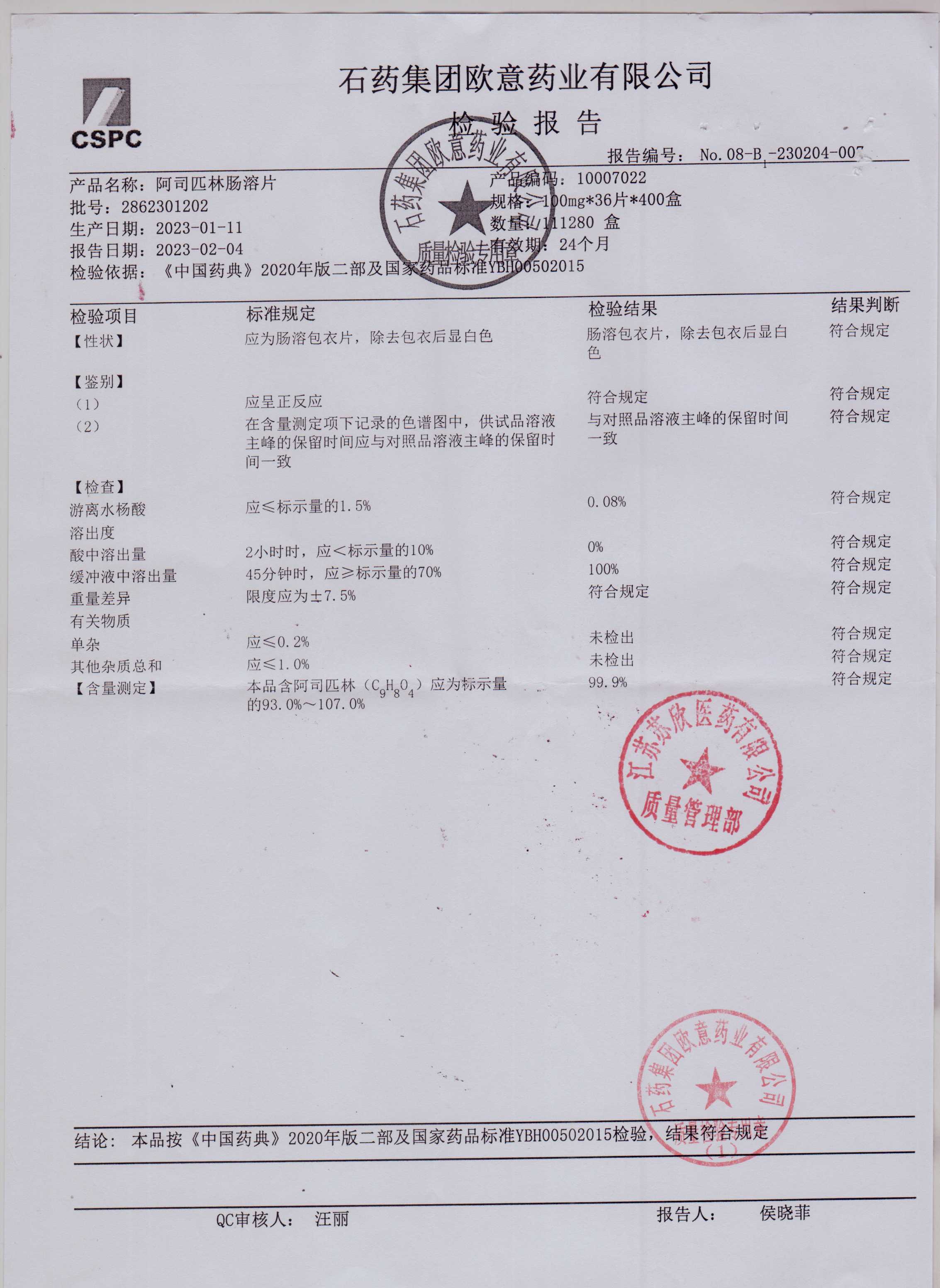 阿司匹林肠溶片2862301202