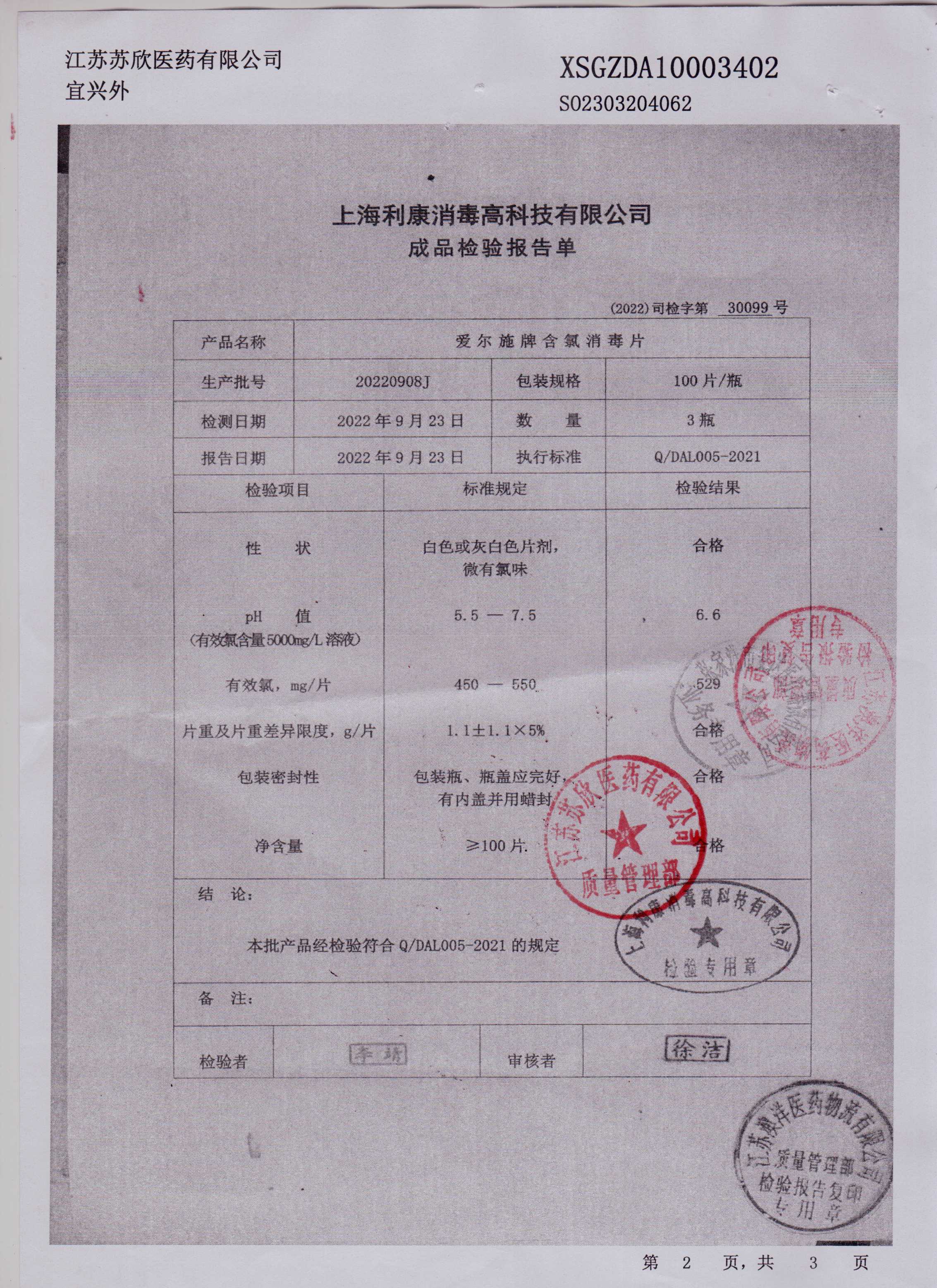 爱尔施牌含氯消毒片20220908J