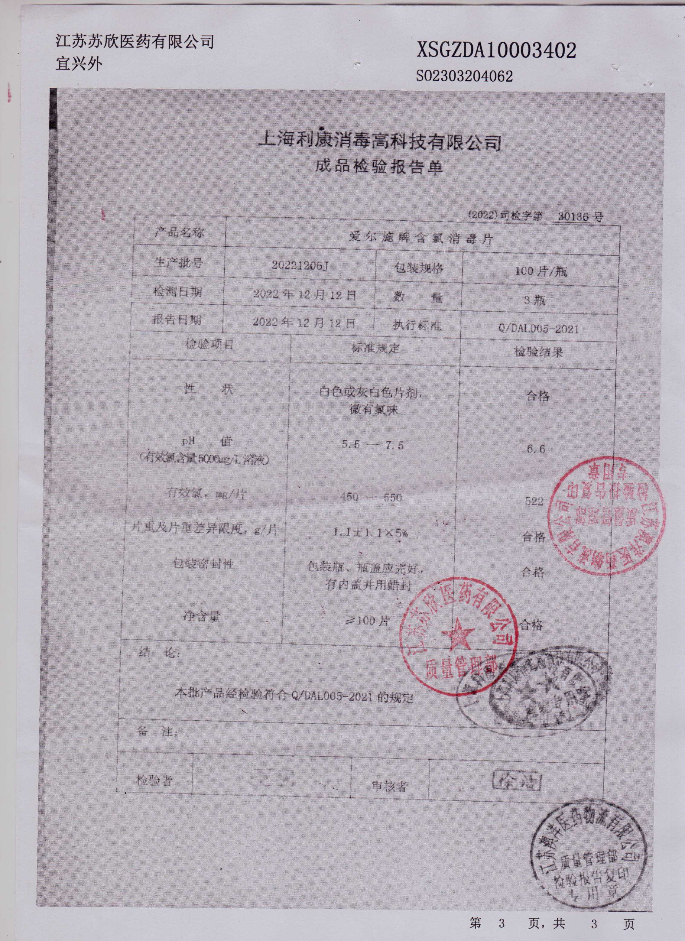 爱尔施牌含氯消毒片20221206J