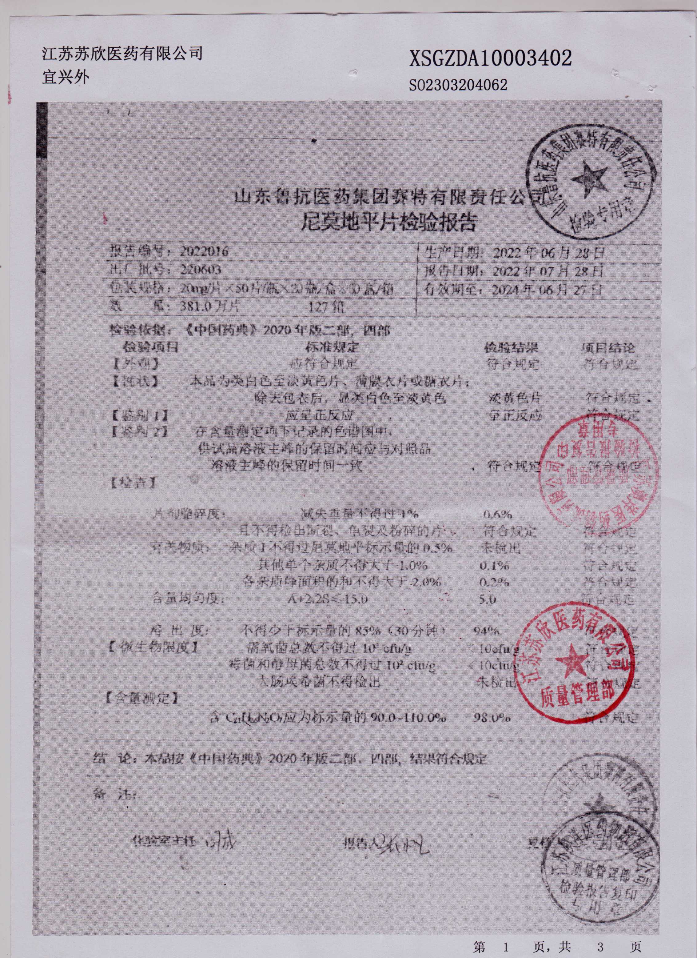 >> 检验报告书 >> 检验报告书