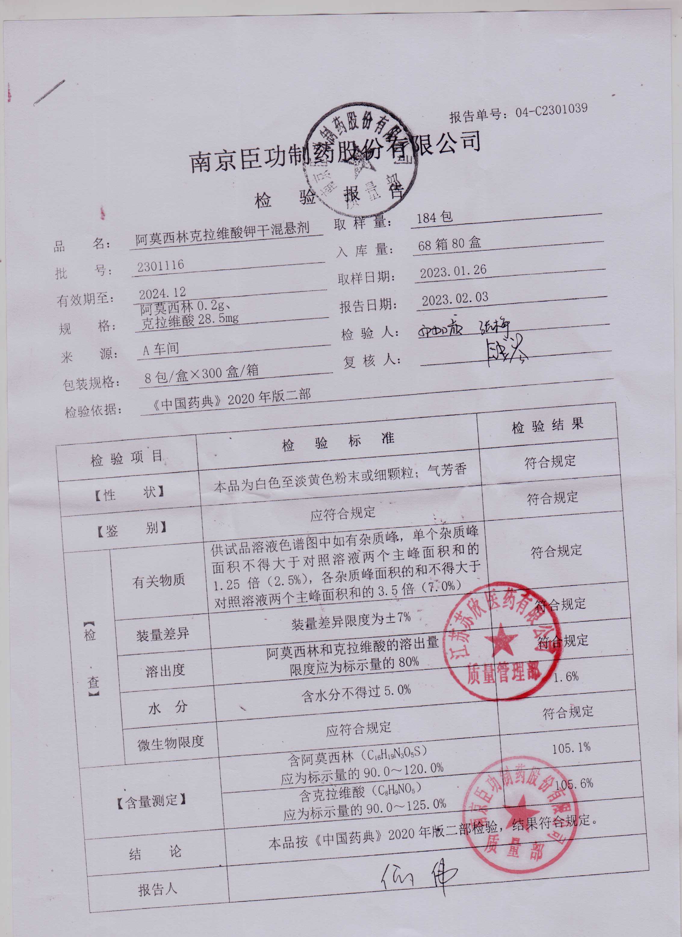 阿莫西林克拉维酸钾干混悬剂2301116
