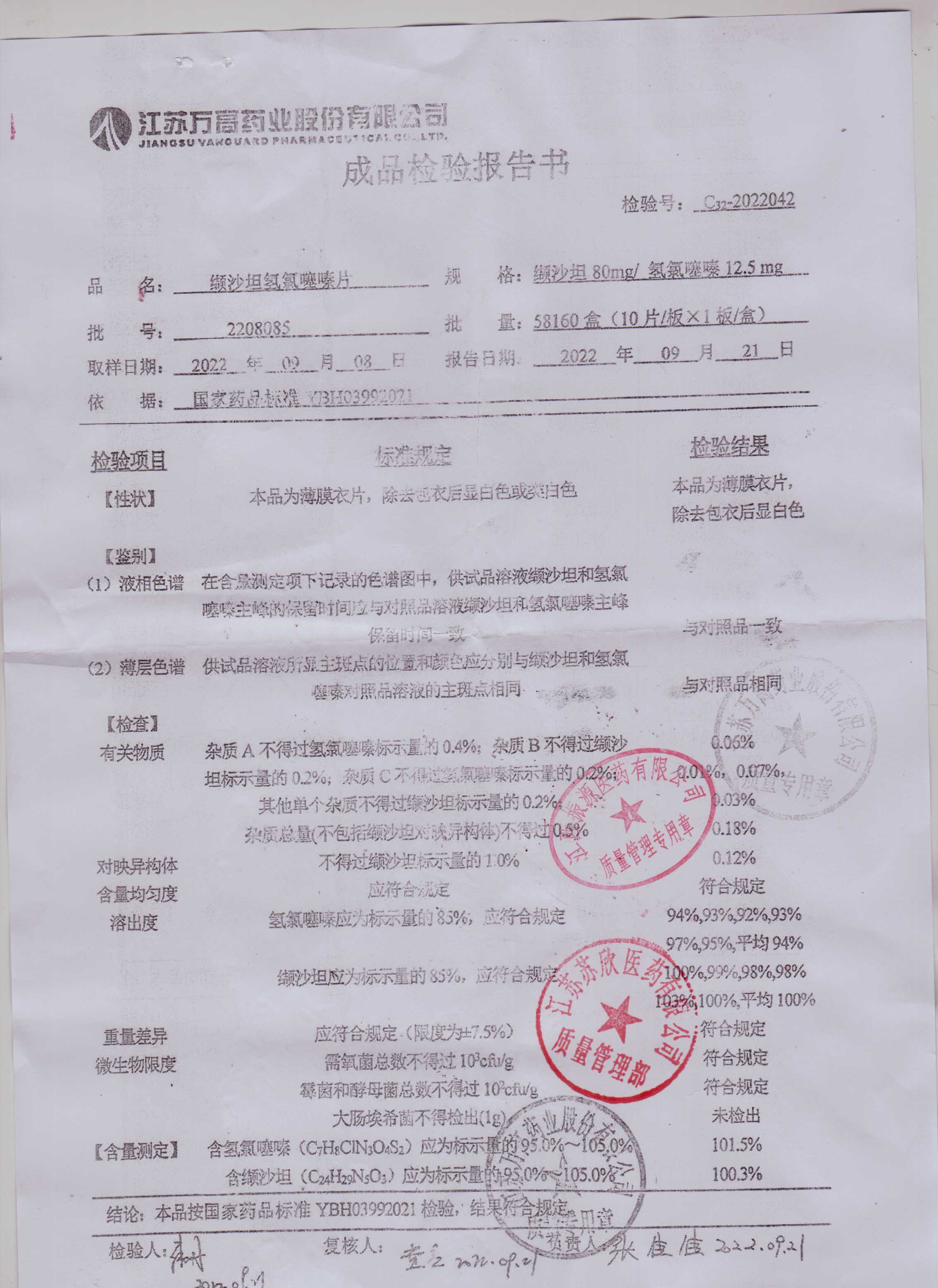 缬沙坦氢氯噻嗪片2208085