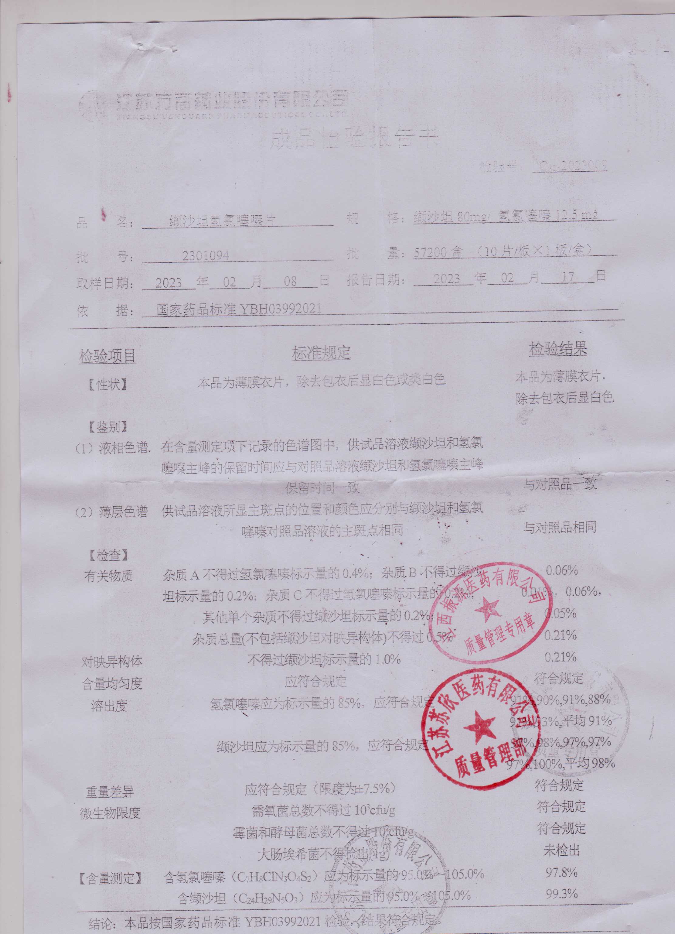 缬沙坦氢氯噻嗪片2301094