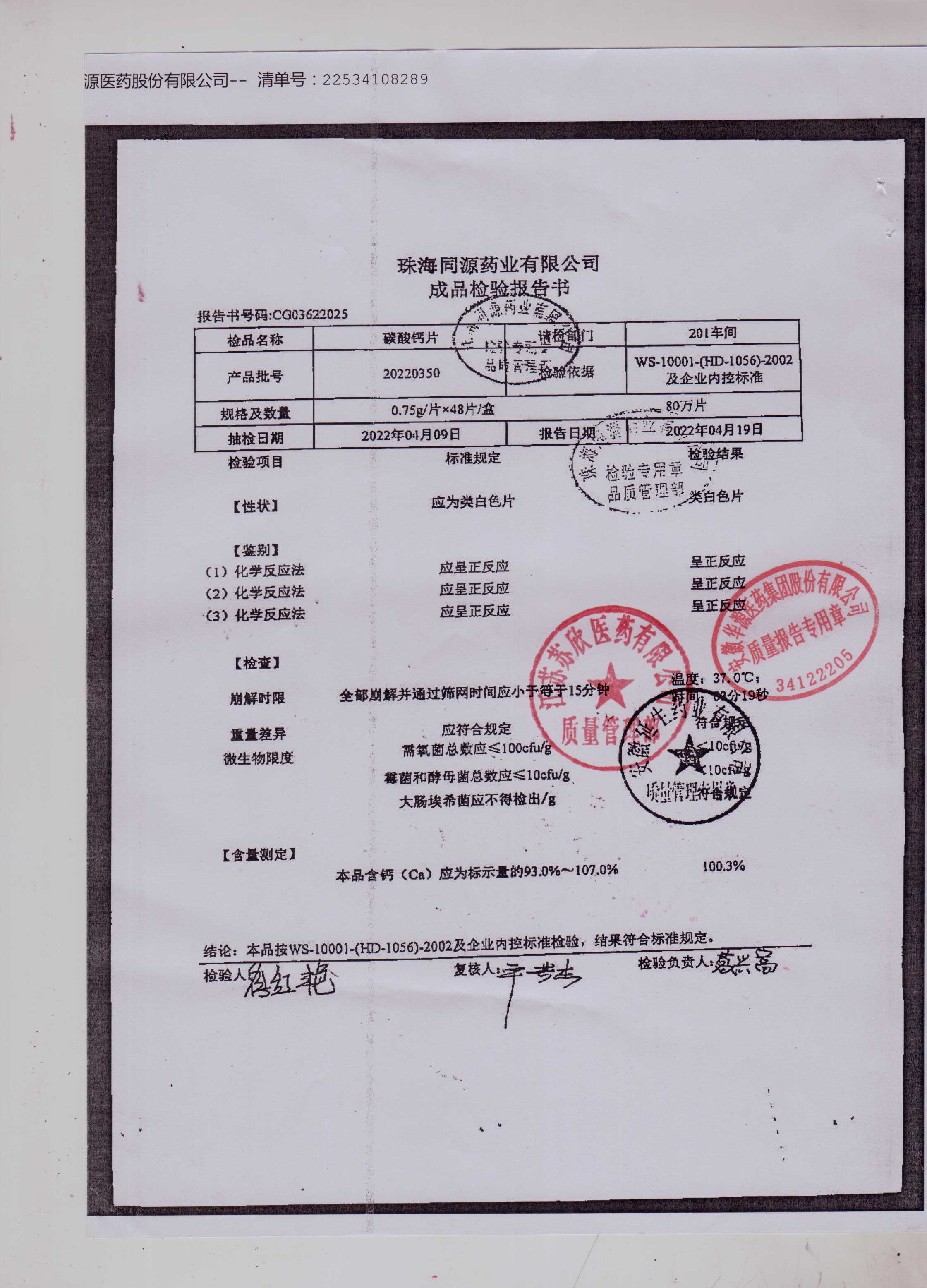 碳酸钙片20220350