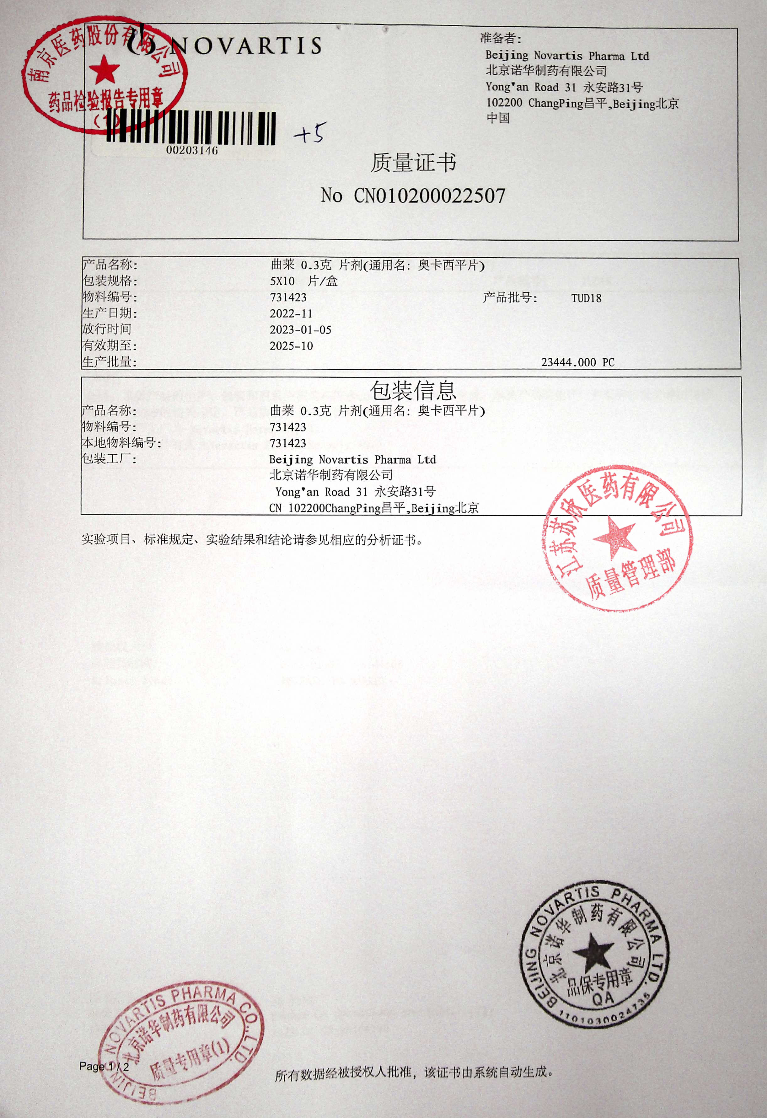 奥卡西平片(曲莱)TUD18(1)