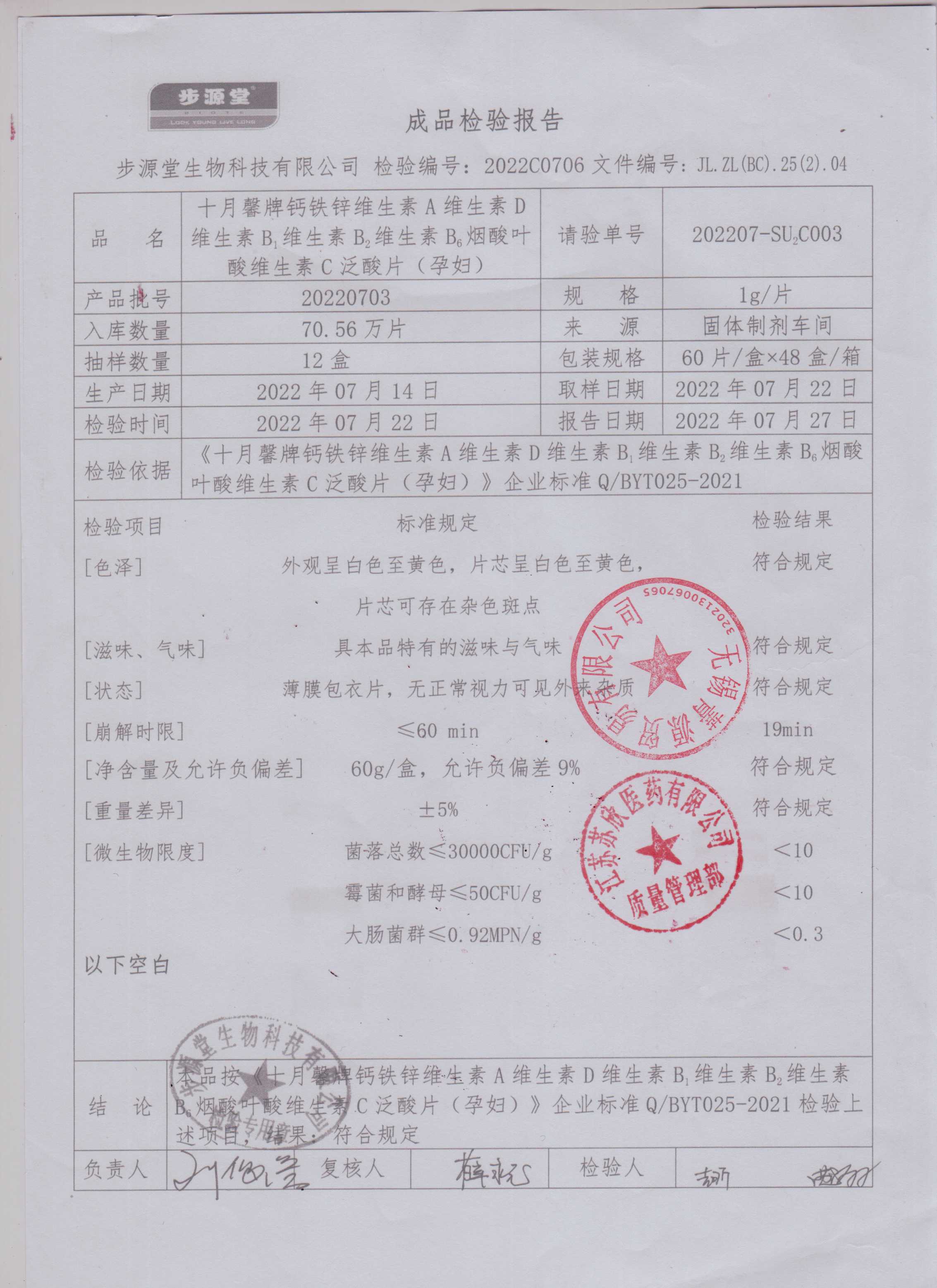 十月馨牌钙铁锌维生素A维生素D维生素B1维生素B2维生素B6烟酸叶酸维生素C泛酸片(孕妇)20220703
