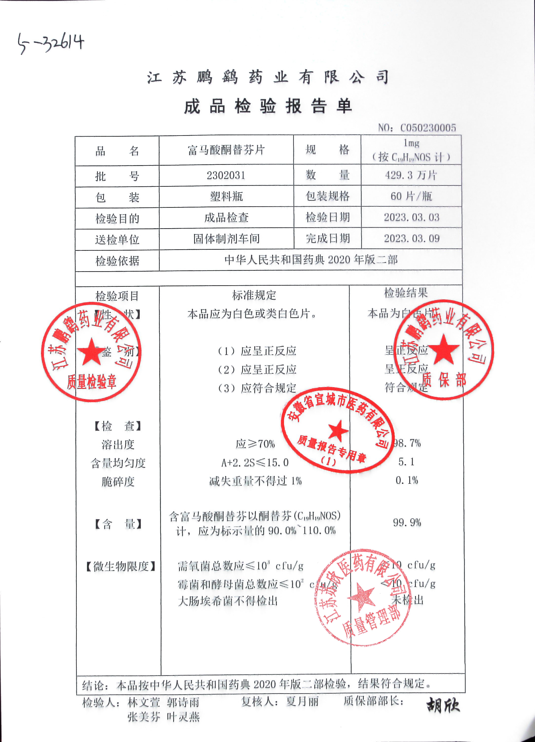富马酸酮替芬片2302031