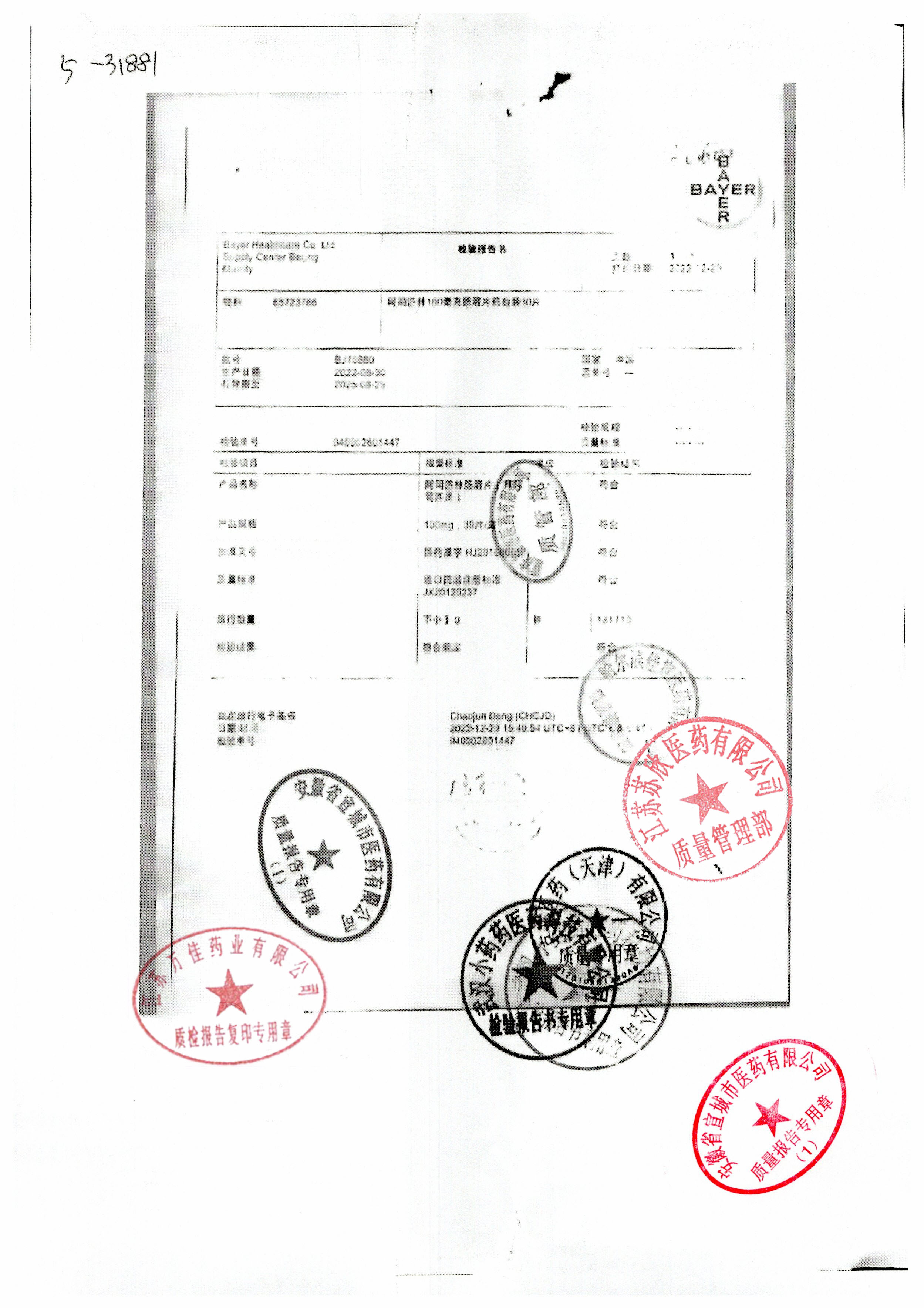 阿司匹林肠溶片(拜阿司匹灵)BJ70880