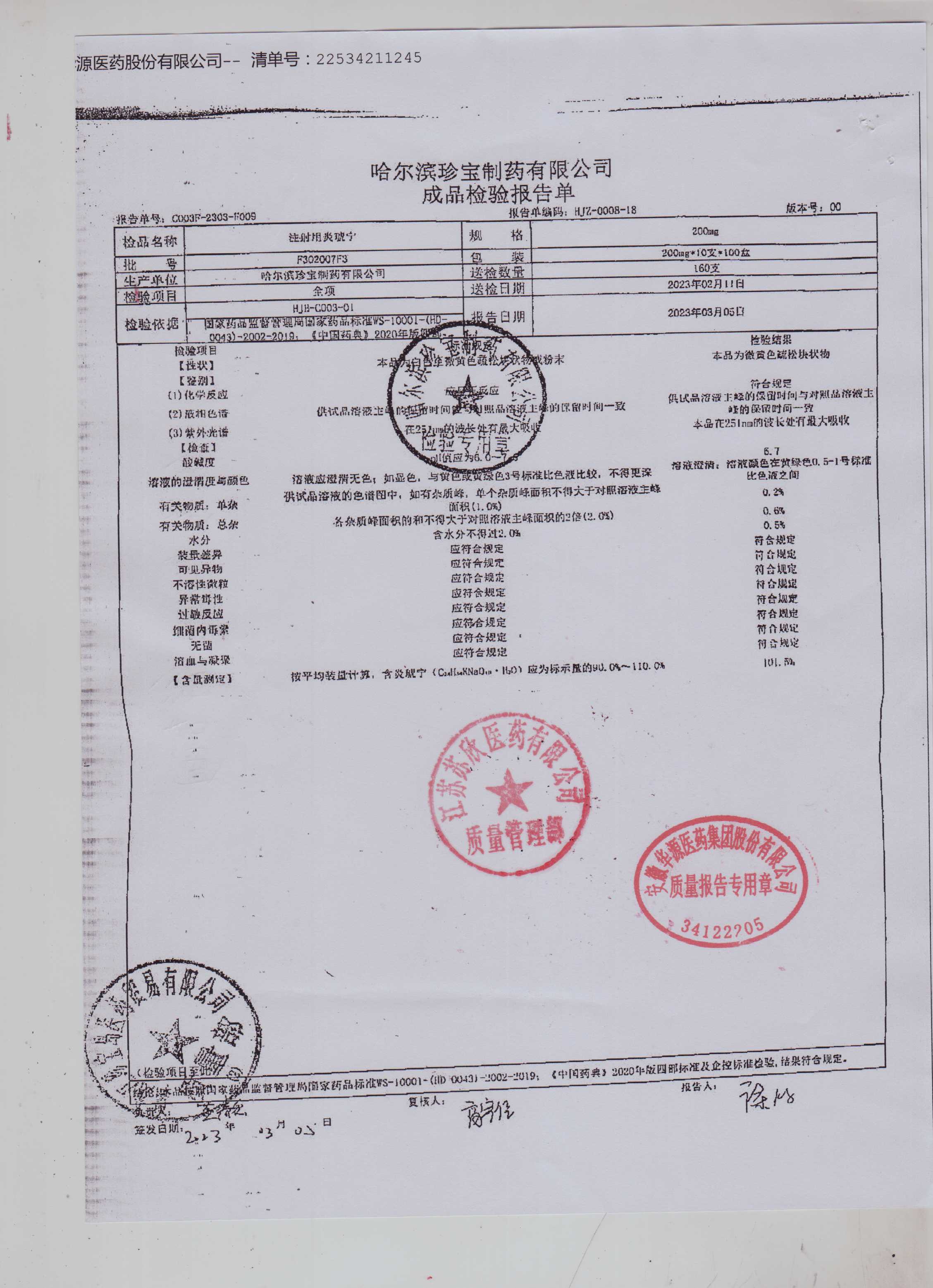 注射用炎琥宁F302007F3