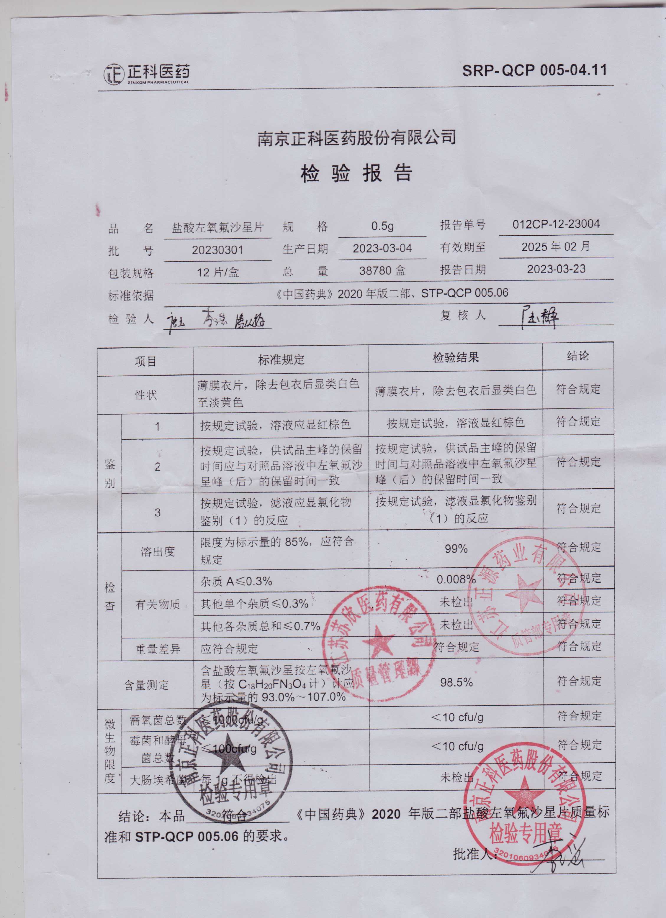 盐酸左氧氟沙星片20230301