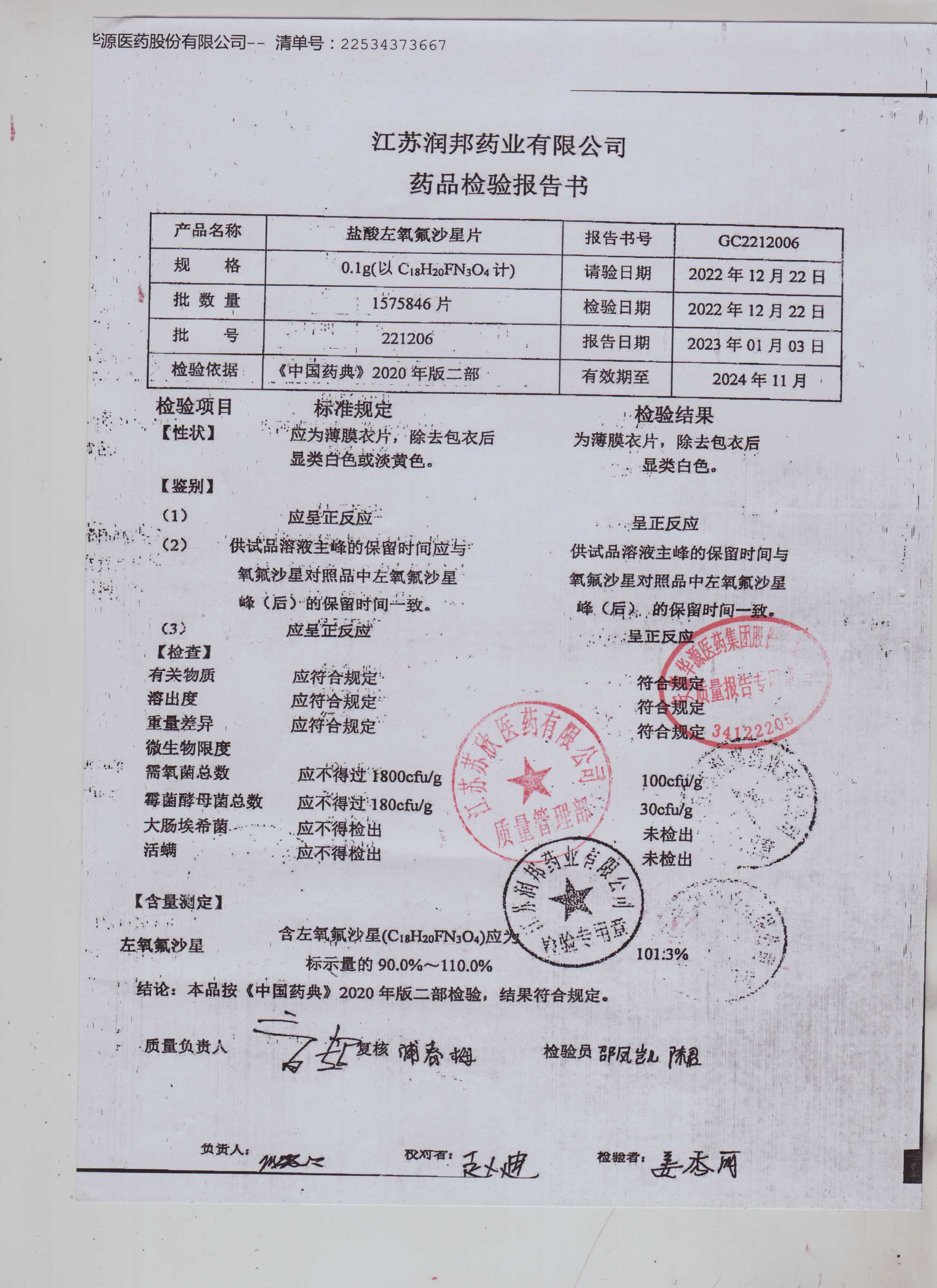 盐酸左氧氟沙星片221206