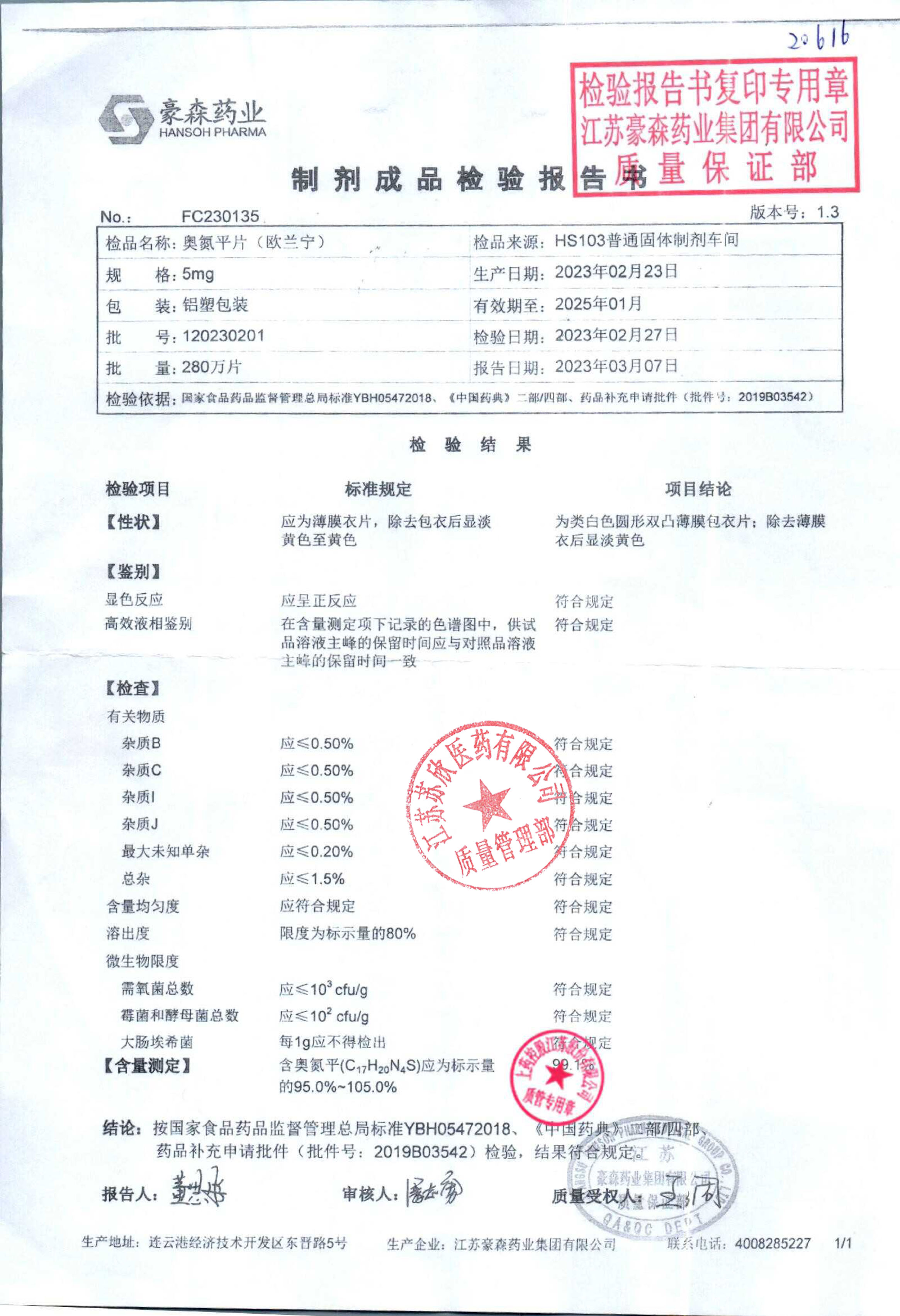 奥氮平片(欧兰宁)120230201