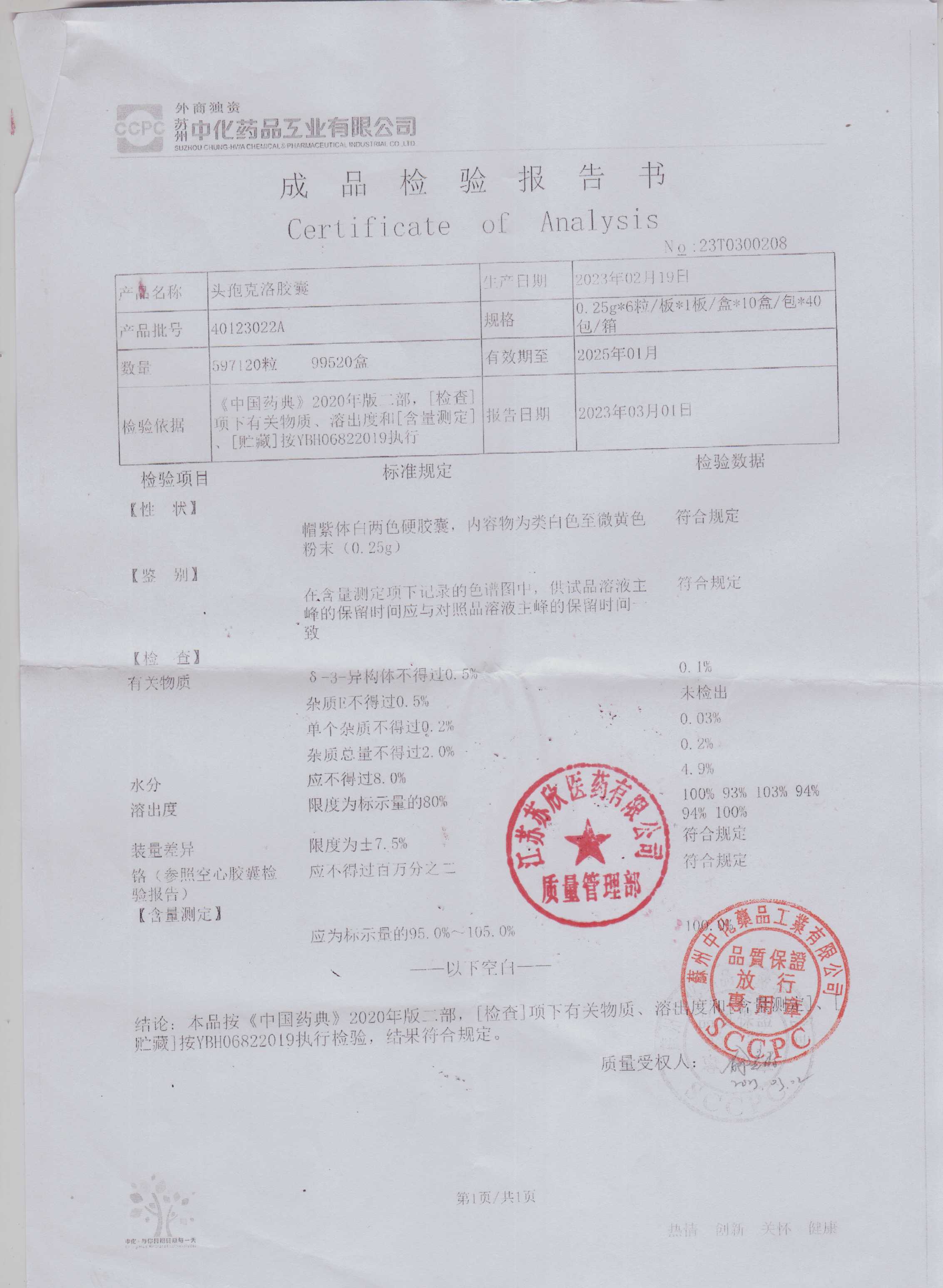 头孢克洛胶囊40123022A