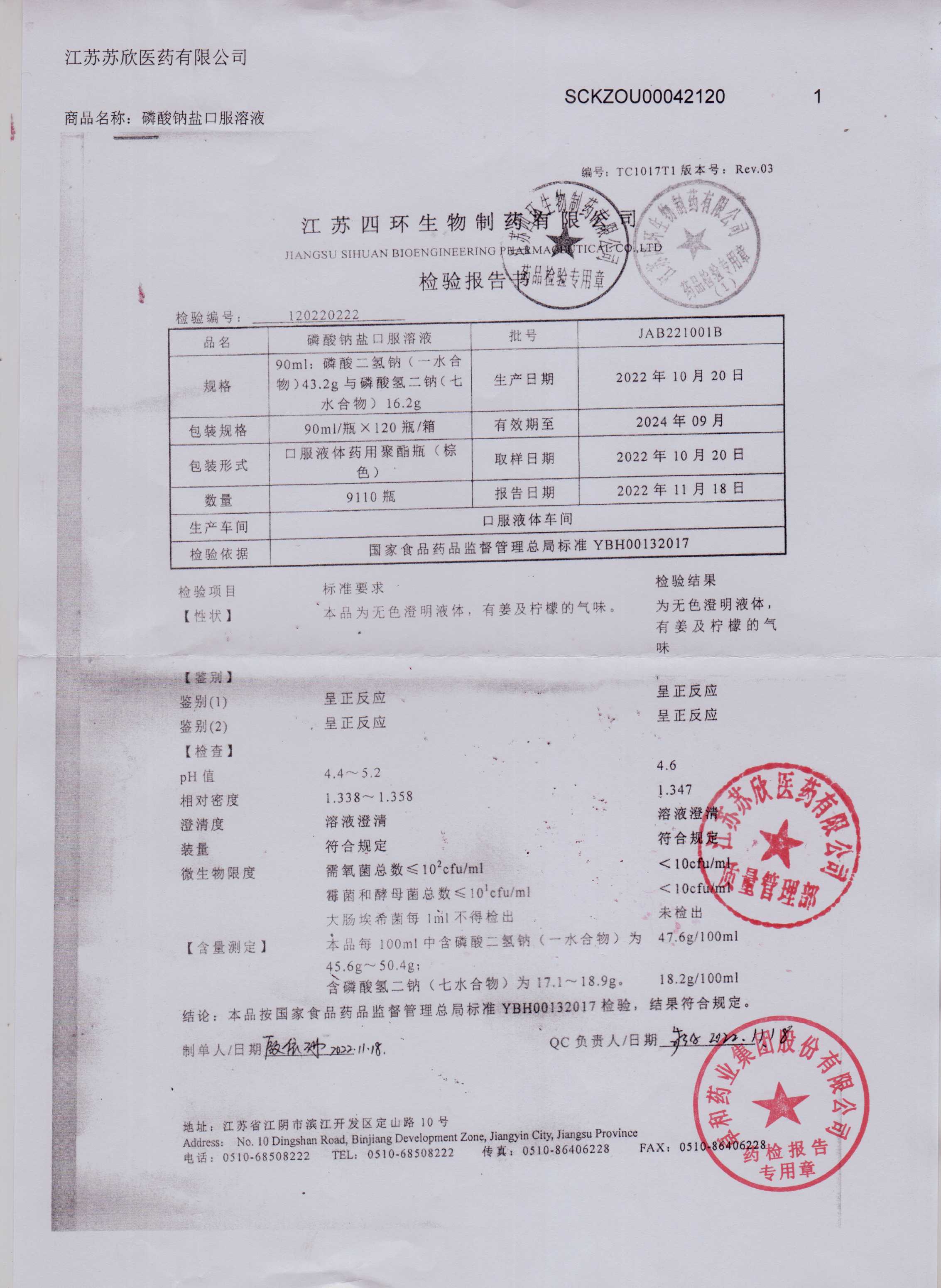 磷酸钠盐口服溶液JAB221001B