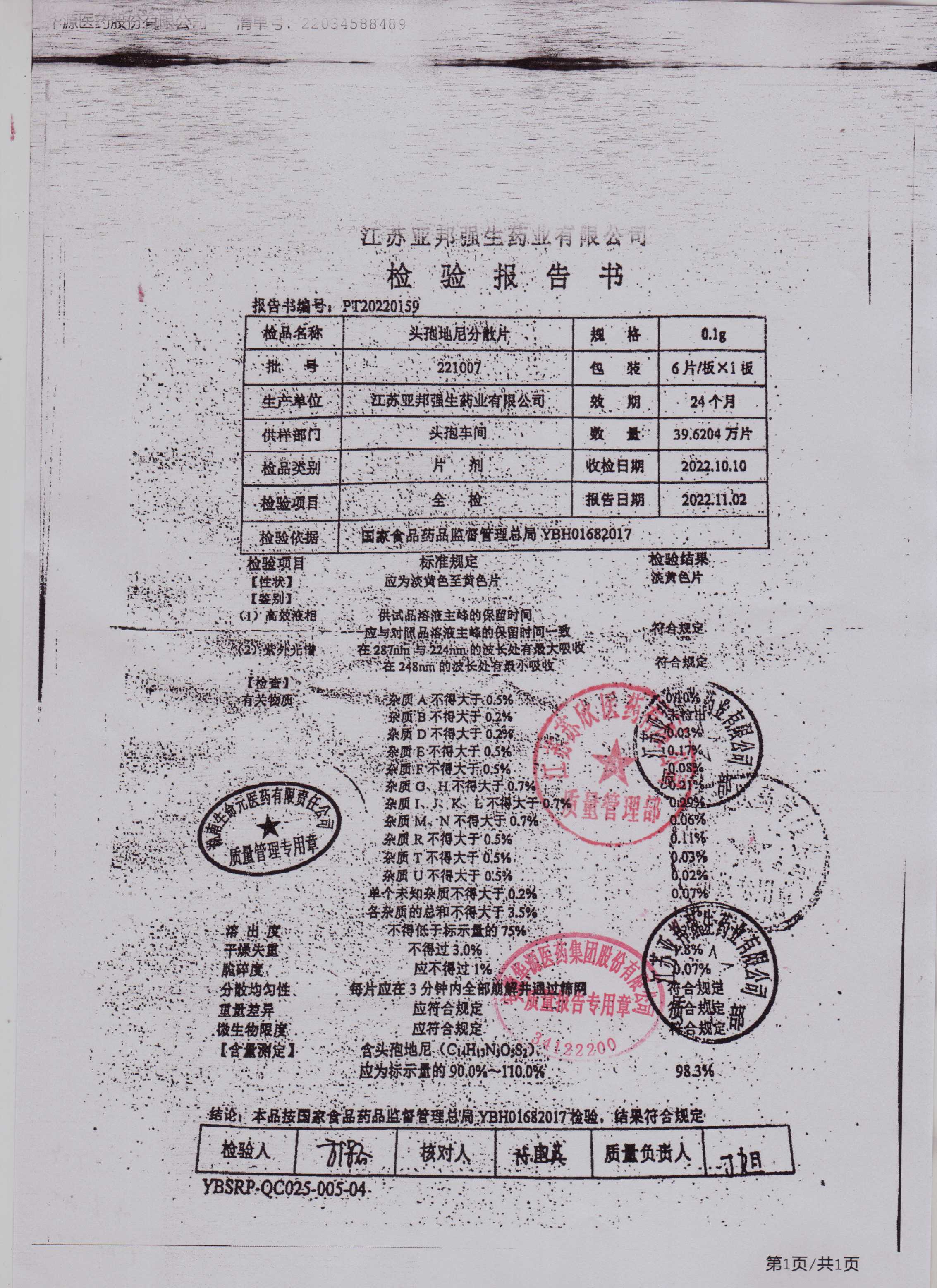 头孢地尼分散片221007