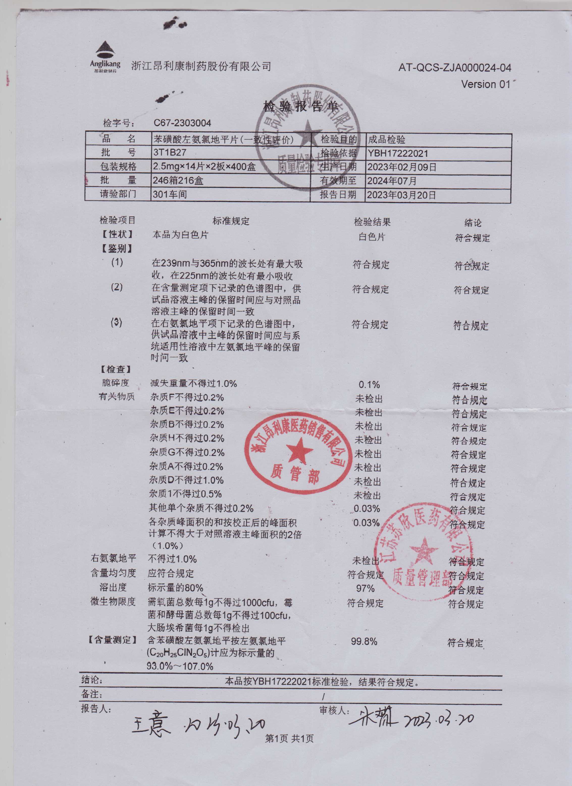 苯磺酸左氨氯地平片3T1B27