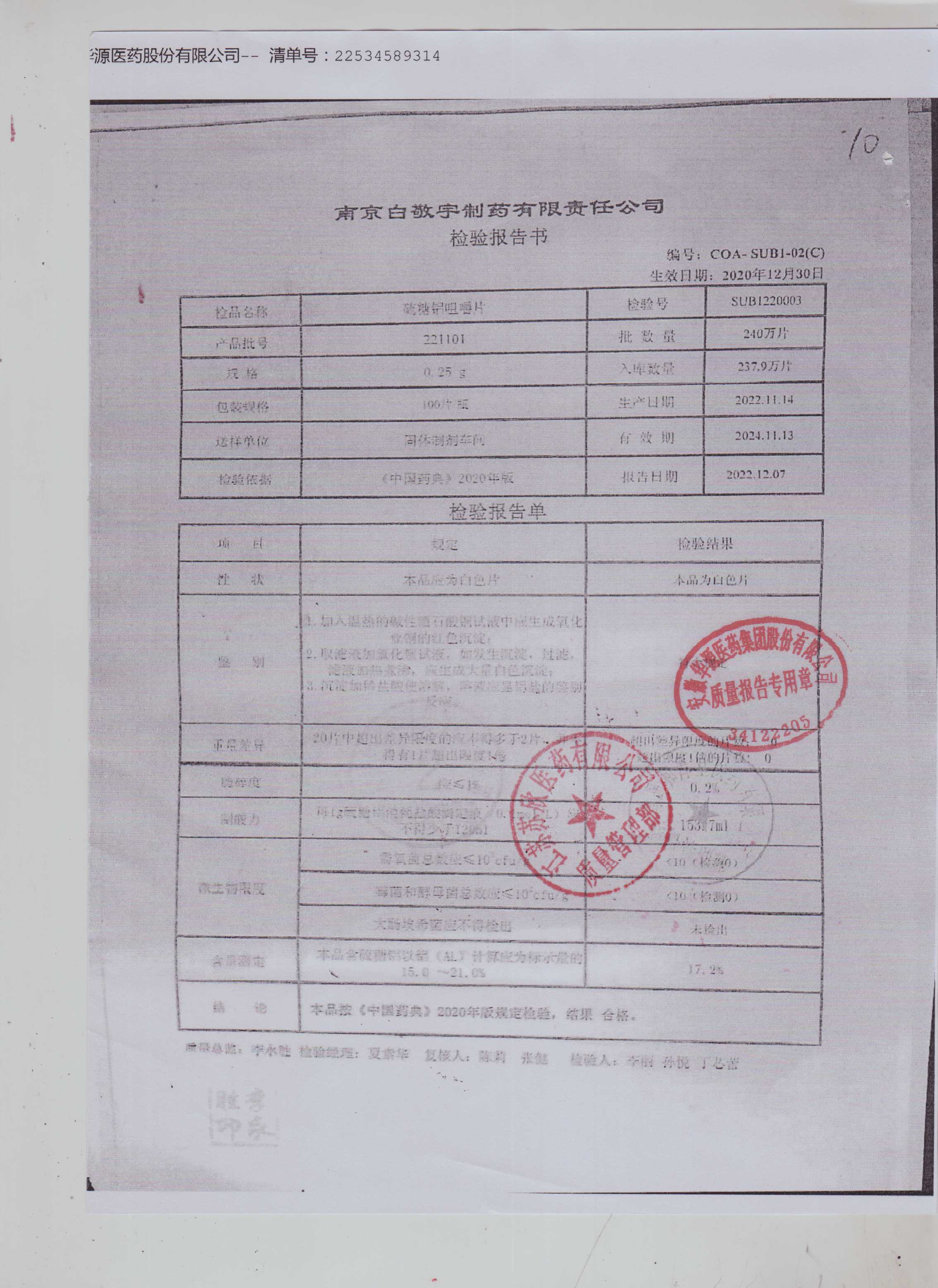 硫糖铝咀嚼片221101