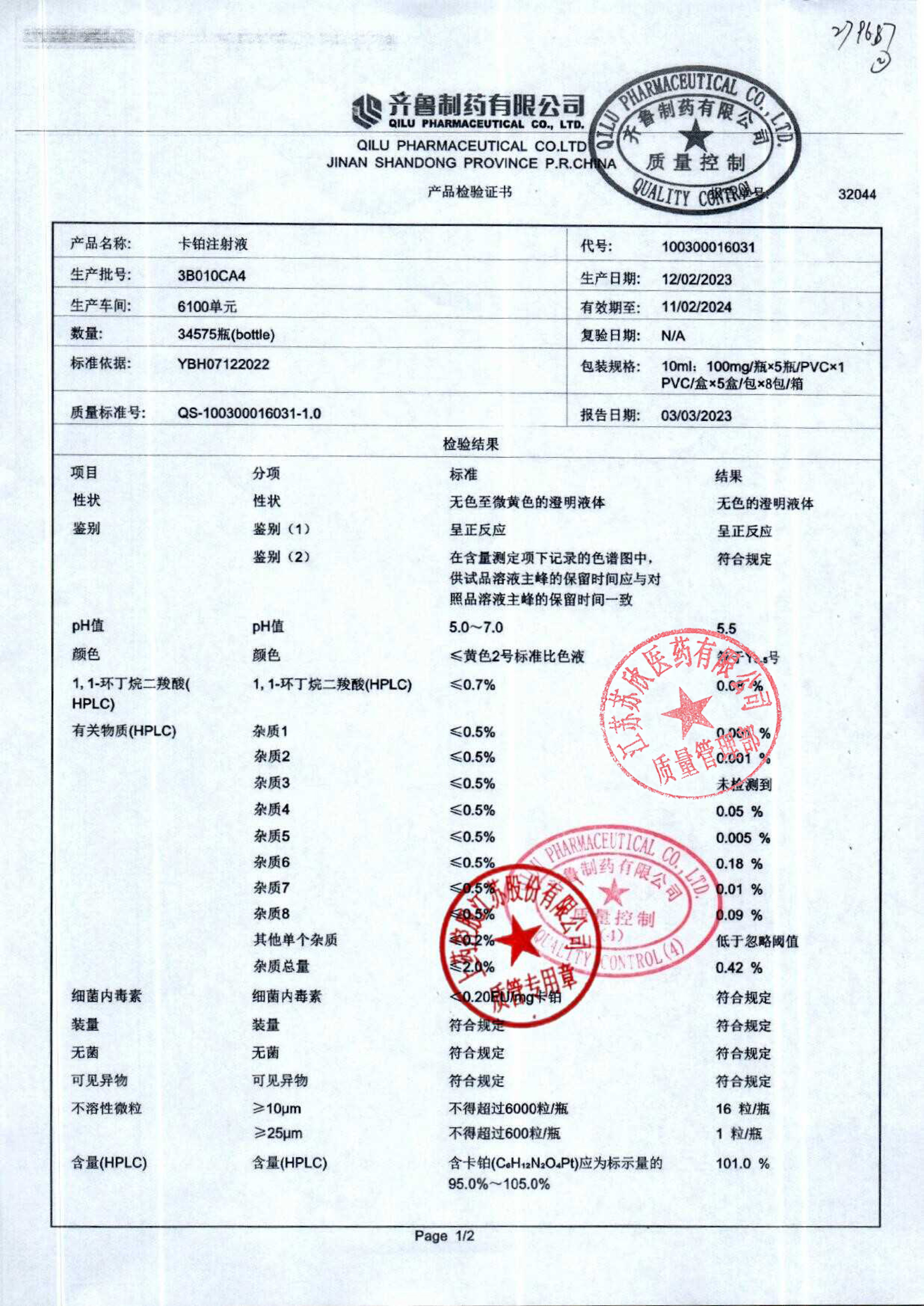 卡铂注射液(波贝)3B010CA4(1)