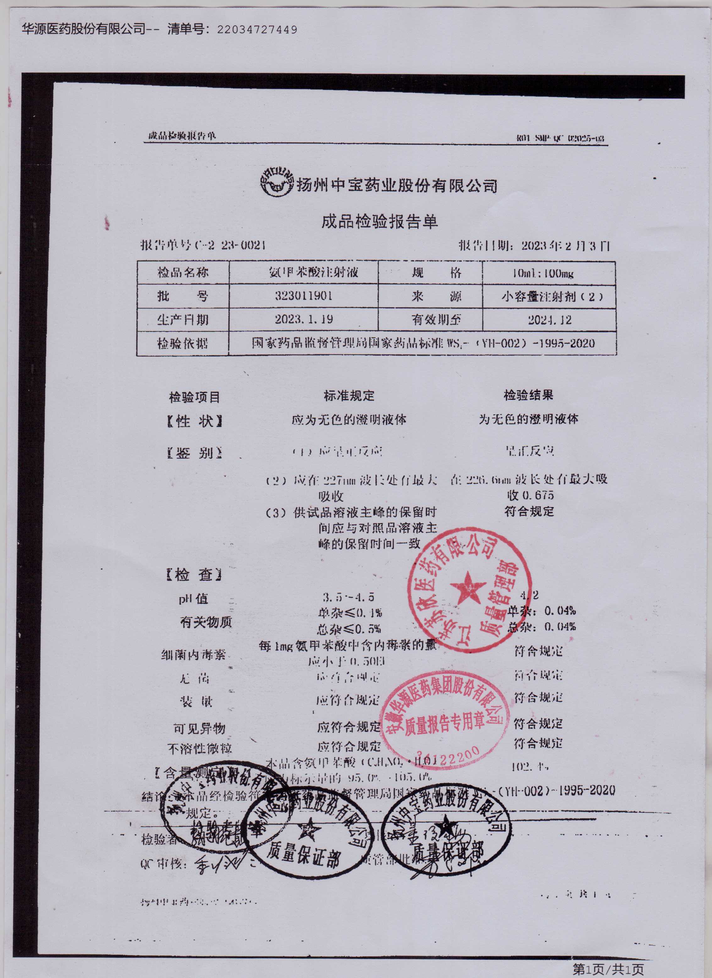 氨甲苯酸注射液323011901