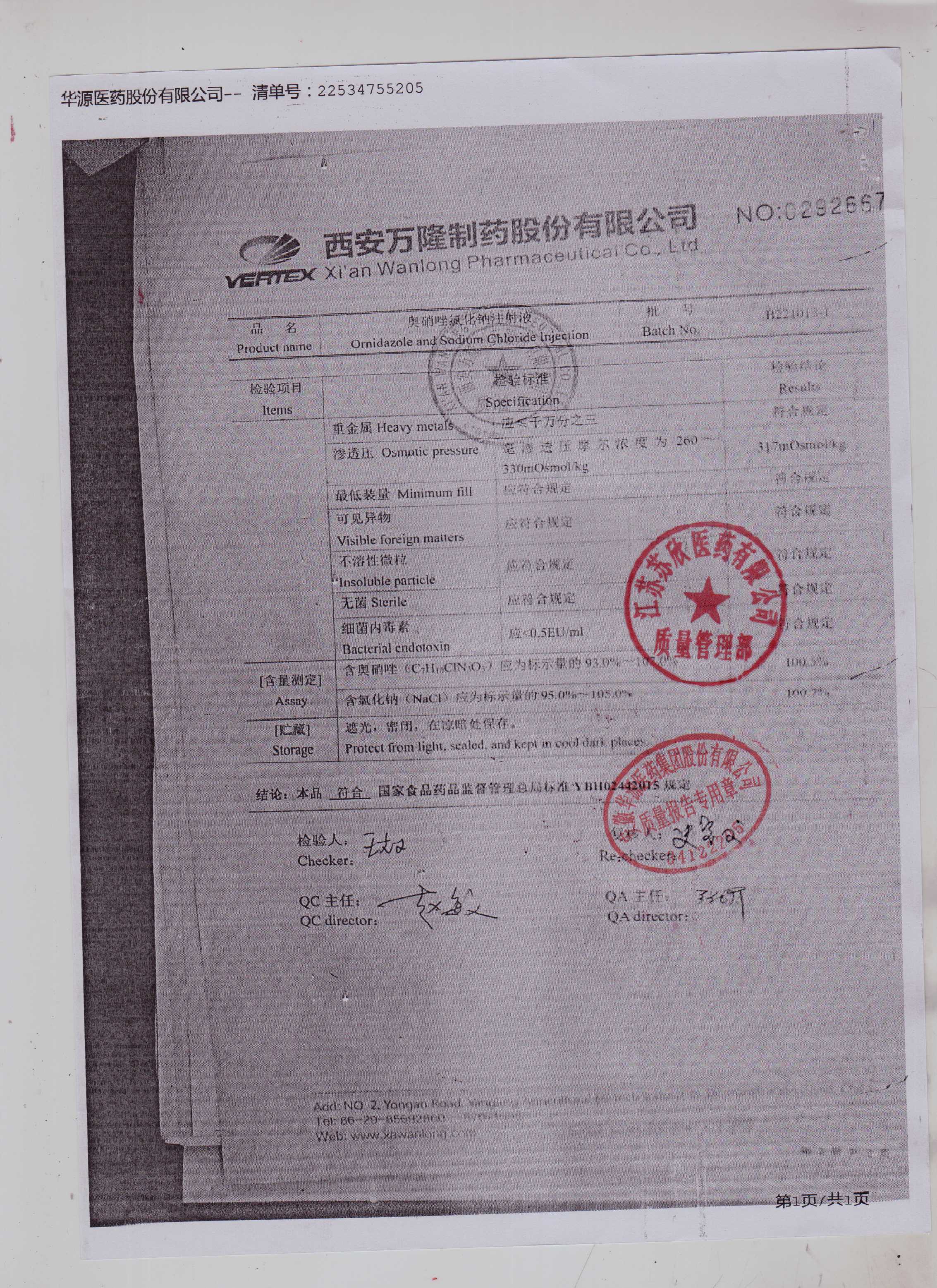 奥硝唑氯化钠注射液B221013-1(2)
