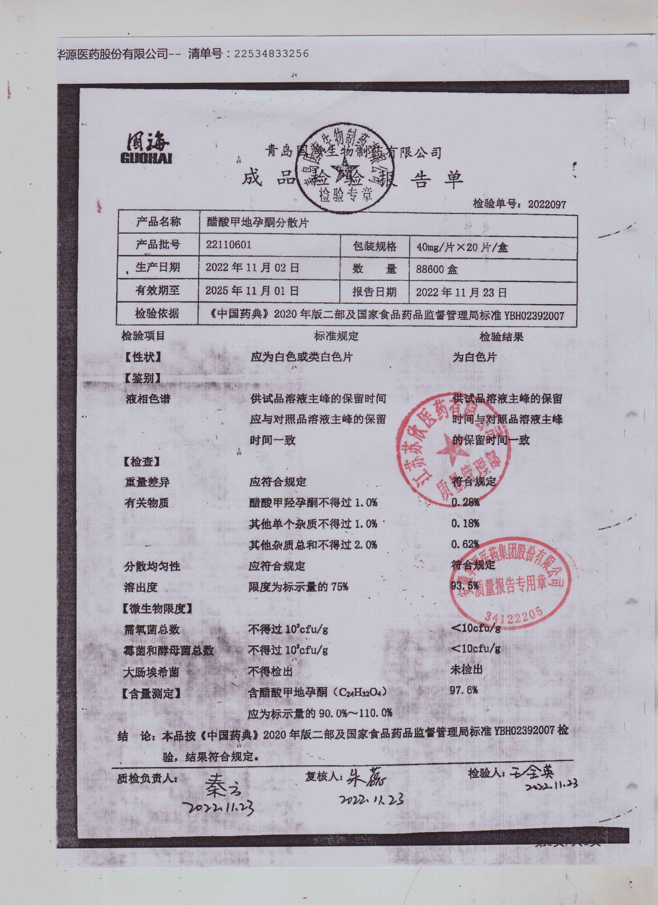 醋酸甲地孕酮分散片22110601